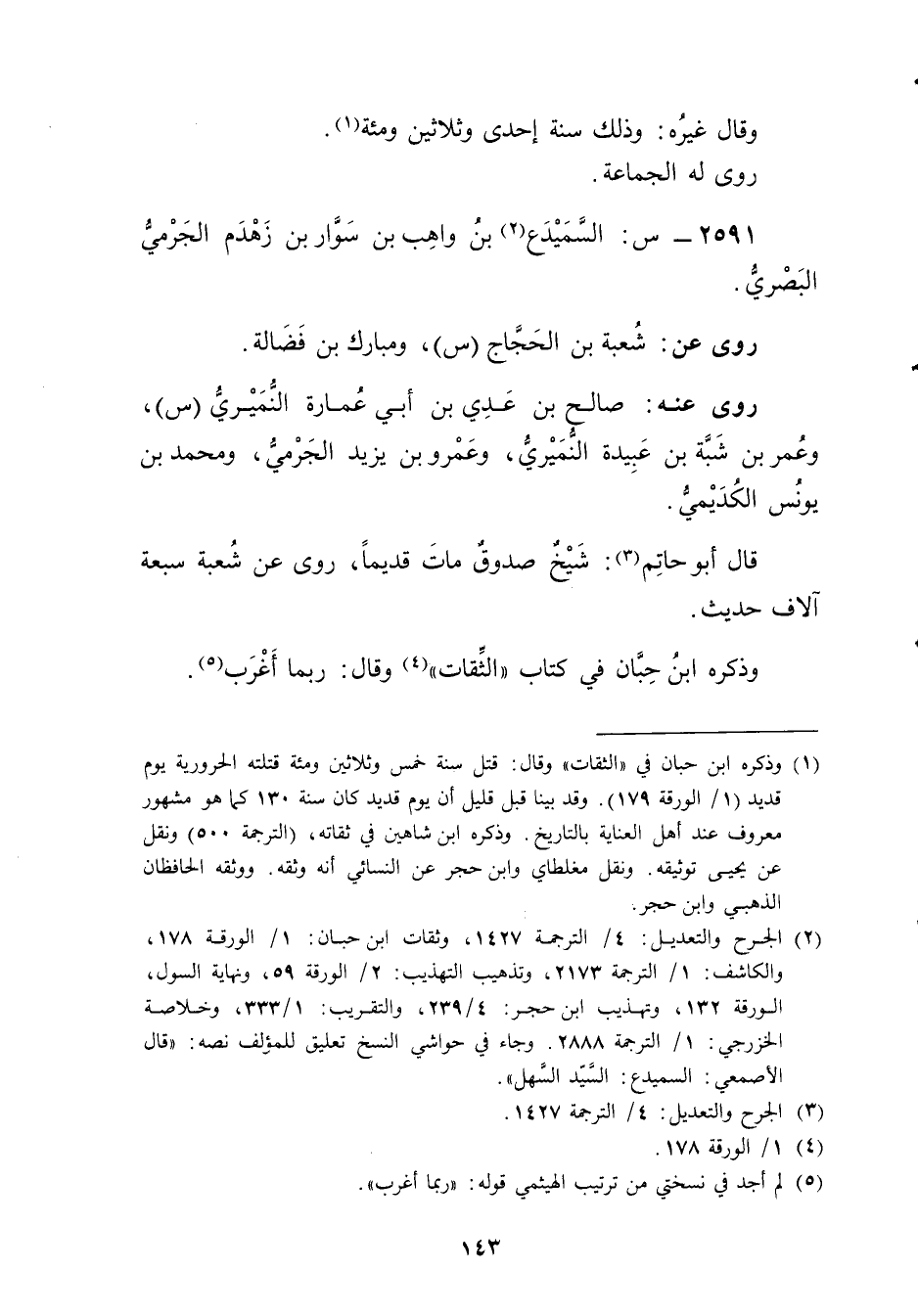 (2) الجرح والتعديل: 4 / الترجمة 1427، وثقات ابن حبان: 1 / الورقة 178، والكاشف: 1 / الترجمة 2173، وتذهيب التهذيب: 2 / الورقة 59، ونهاية السول، الورقة 132، وتهذيب ابن حجر: 4 / 239، والتقريب: 1 / 333، وخلاصة الخزرجي: 1 / الترجمة 2888. وجاء في حواشي النسخ تعليق للمؤلف نصه: قال الأَصْمَعِيّ: السميدع: السيد السهل.