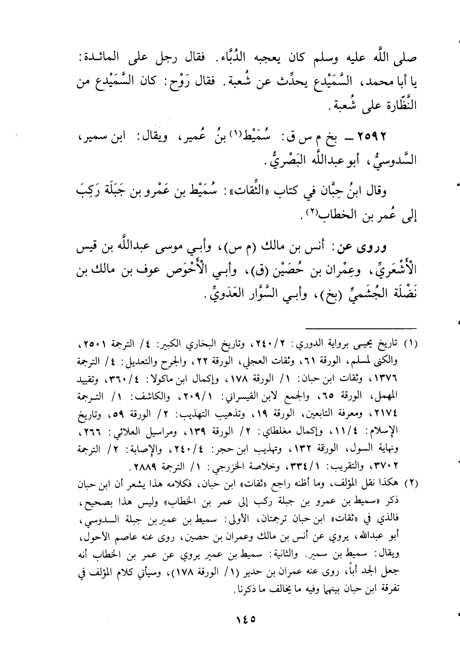 والثانية: سميط بن عُمَير يروي عن عُمَر بن الخطاب أنه جعل الجد أبا، روى عنه عِمْران بن حدير (1 / الورقة 178) ، وسيأتي كلام المؤلف في تفرقة ابن حبان بينهما وفيه ما يخالف ما ذكرنا.
