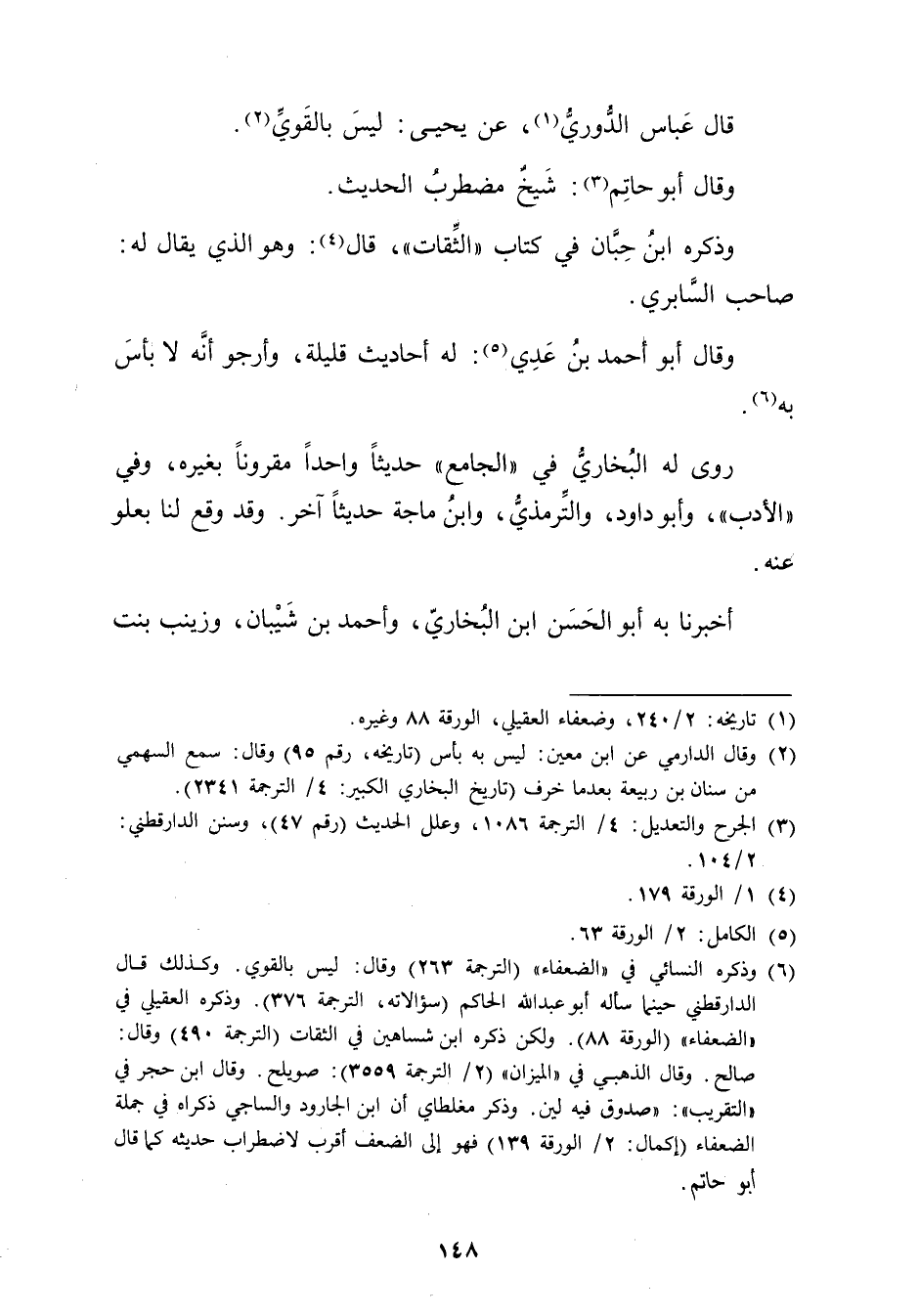 (1) تاريخه: 2 / 240، وضعفاء العقيلي، الورقة 88 وغيره.