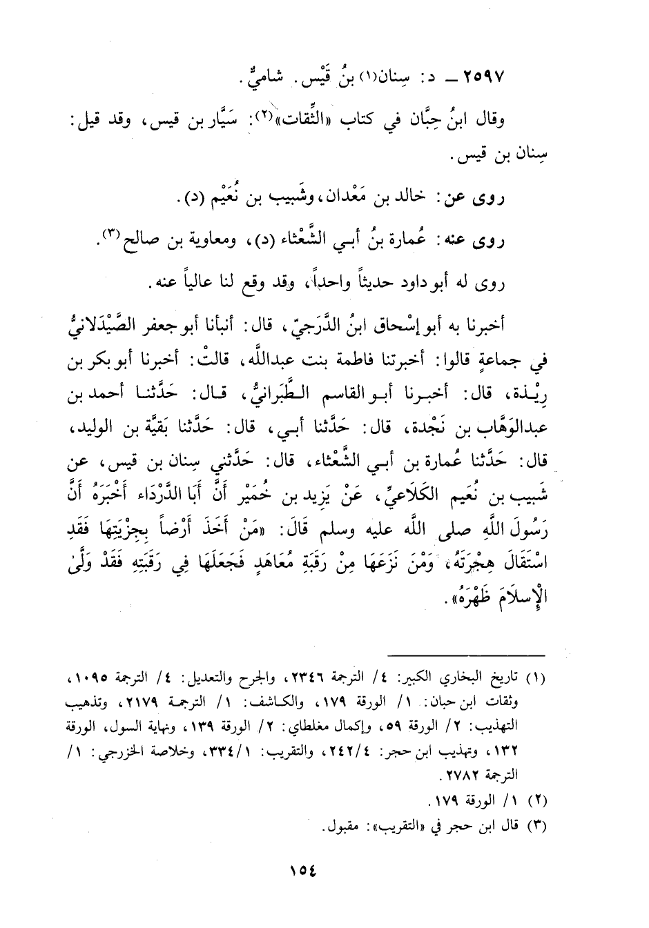 فِي جَمَاعَةٍ قَالُوا: أَخْبَرَتْنا فَاطِمَةُ بِنْتُ عَبد اللَّهِ، قَالَتْ: أخبرنا أَبُو بَكْرِ بْنُ رِيذَةَ، قال: أخبرنا أَبُو الْقَاسِمِ الطَّبَرَانِيُّ، قال: حَدَّثَنَا أَحْمَدُ بْنُ عَبْدِ الْوَهَّابِ بْنِ نَجْدَةَ، قال: حَدَّثَنَا أَبِي، قال: حَدَّثَنَا بَقِيَّةُ بْنُ الْوَلِيدِ، قال: حَدَّثَنَا عِمَارَةُ بْنُ أَبي الشَّعْثَاءِ، قال: حَدَّثَنِي سِنَانُ بْنُ قَيْسٍ، عَنْ شَبِيبِ بْنِ نُعَيْمٍ الْكِلاعِيِّ، عَنْ يَزِيدَ بْنِ خُمَيْرٍ إِنَّ أَبَا الدَّرْدَاءِ أَخْبَرَهُ أَنَّ رَسُول اللَّهِ صلى الله عليه وسَلَّمَ قال: مَنْ أَخَذَ أَرْضًا بِجِزْيَتِهَا فَقَدِ اسْتَقال هِجْرَتَهُ، ومَنْ نَزَعَهَا مِنْ رَقَبَةِ مُعَاهَدٍ فَجَعَلَهَا فِي رَقَبَتِهِ فَقَدْ ولَّى الإِسْلامَ ظهره.