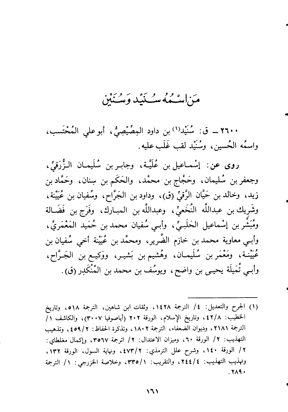 2600 - ق: سنيد بن داود المصيصي (1) ، أَبُو علي المحتسب، واسمه الْحُسَيْن، وسنيد لقب غلب عليه.