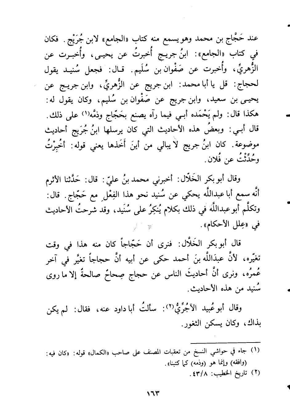 وَقَال أبو بَكْر الخلال: أخبرني مُحَمَّد بْن علي: قال: حَدَّثَنَا الأثرم أنه سمع أبا عَبد الله يحكي عَنْ سنيد نحو هذا الفعل مع حجاج. قال: وتكلم أَبُو عَبْد اللَّهِ فِي ذلك بكلام ينكر على سنيد، وقد شرحت الأحاديث فِي "علل الأحكام.