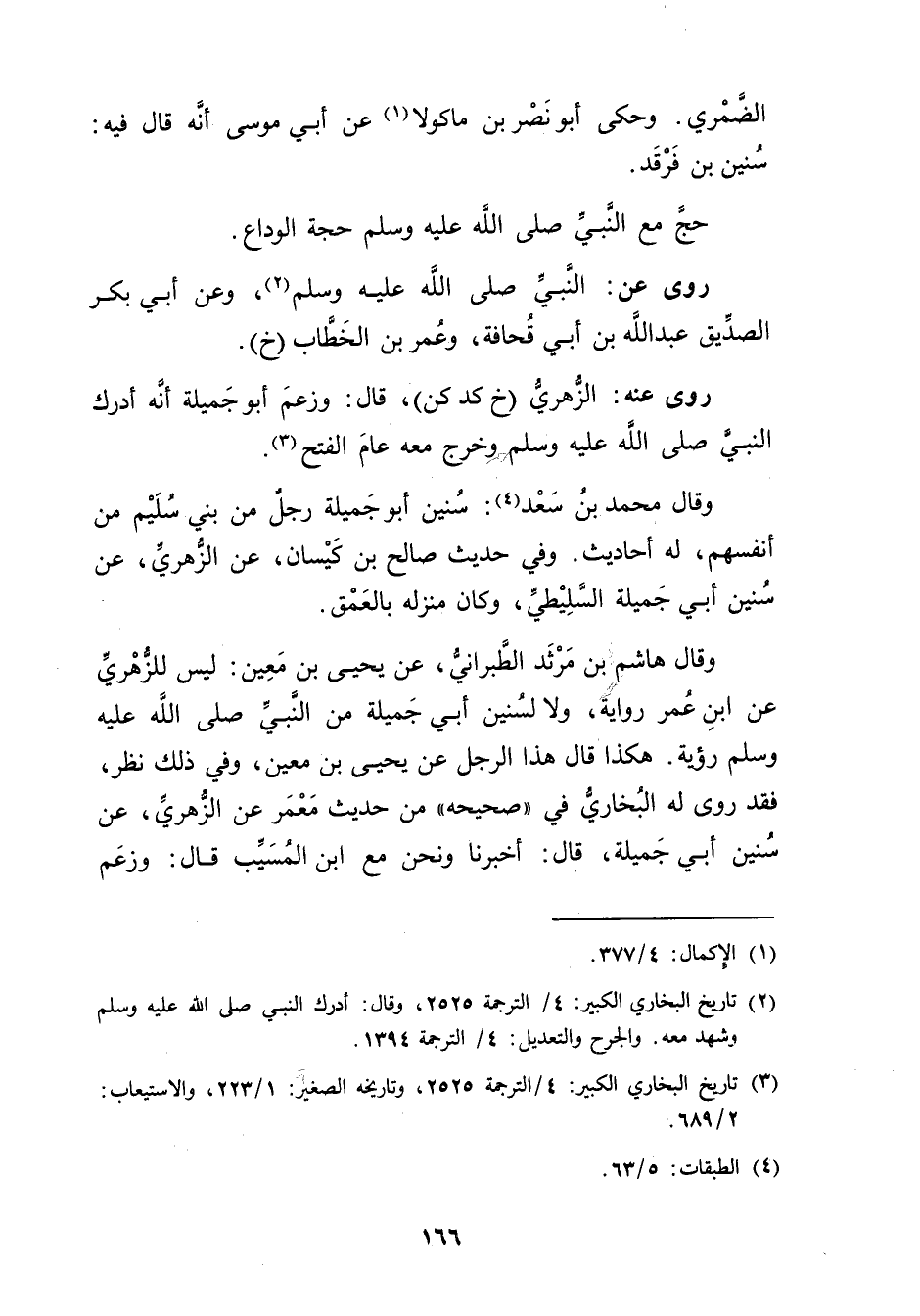 وَقَال مُحَمَّد بْن سعد (4) : سنين أَبُو جميلة رجل من بني سليم من أنفسهم، له أحاديث. وفي حديث صالح بْن كيسان، عَنِ الزُّهْرِيّ، عَنْ سنين أبي جميلة السليطي، وكَانَ منزله بالعمق.