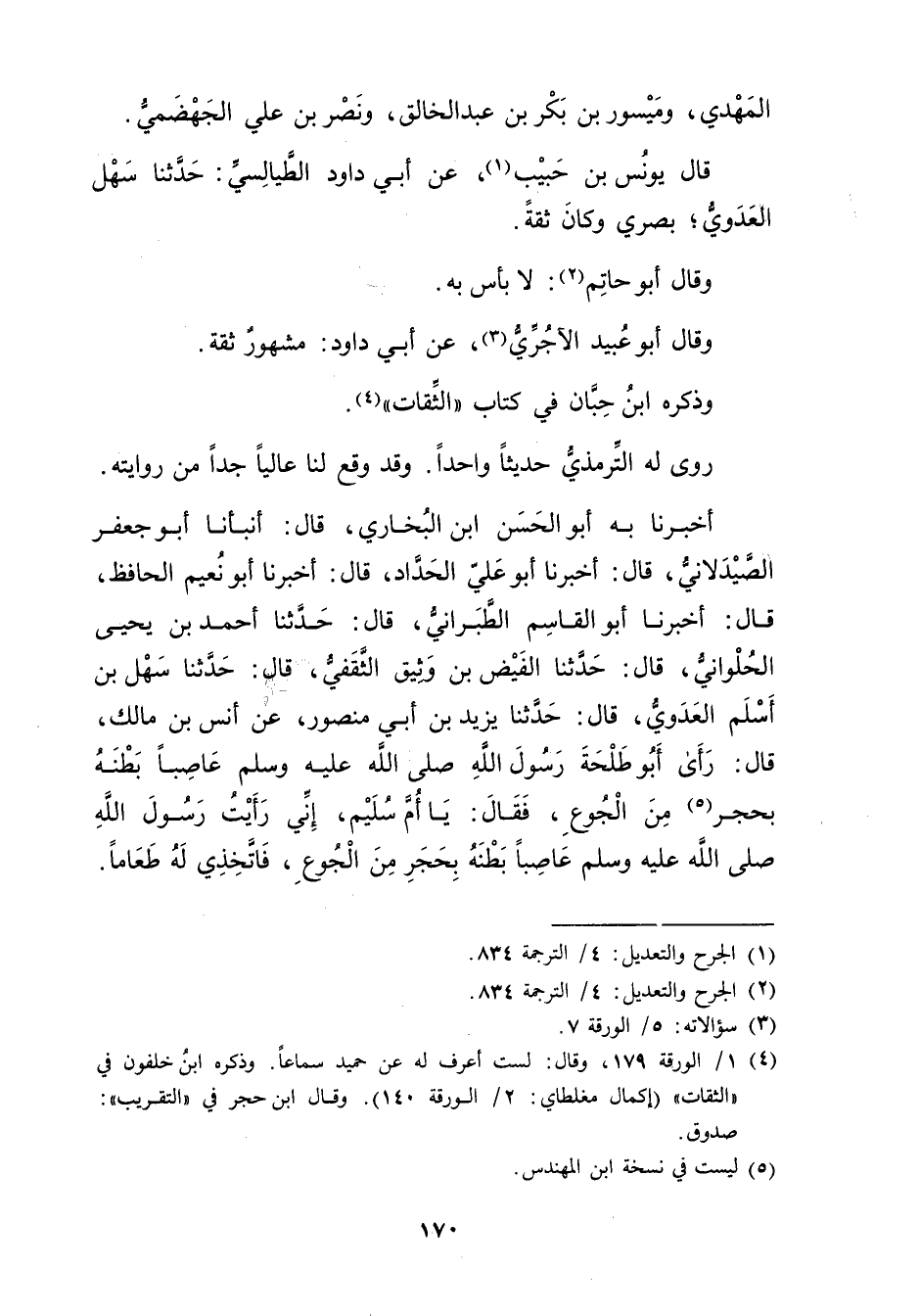 (4) 1 / الورقة 179، وَقَال: لست أعرف له عن حميد سماعا. وذكره ابن خلفون في "الثقات" (إكمال مغلطاي: 2 / الورقة 140) . وَقَال ابن حجر في "التقريب": صدوق.