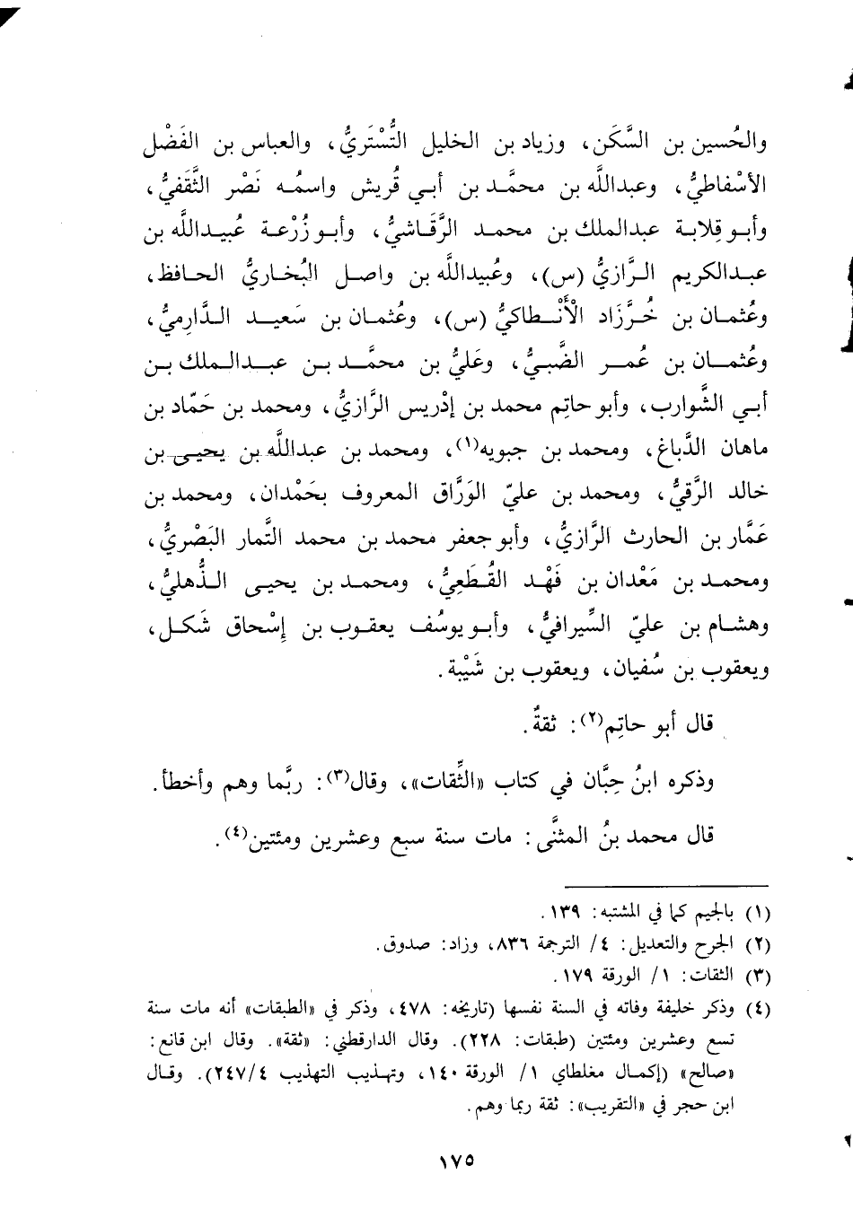 (4) وذكر خليفة وفاته في السنة نفسها (تاريخه: 478، وذكر في "الطبقات"أَنَّهُ مات سنة تسع وعشرين ومئتين (طبقات: 228) . وَقَال الدَّارَقُطْنِيُّ: ثقة". وَقَال ابن قانع: صالح" (إكمال مغلطاي 1 / الورقة 140، وتهذيب التهذيب 4 / 247) . وَقَال ابن حجر في "التقريب": ثقة ربما وهم.