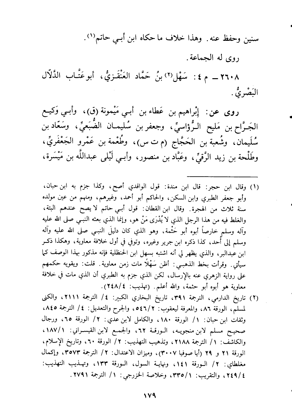 2608 - م 4: سهل بن حماد العنقزي (2) ، أَبُو عتاب الدلال البَصْرِيّ.