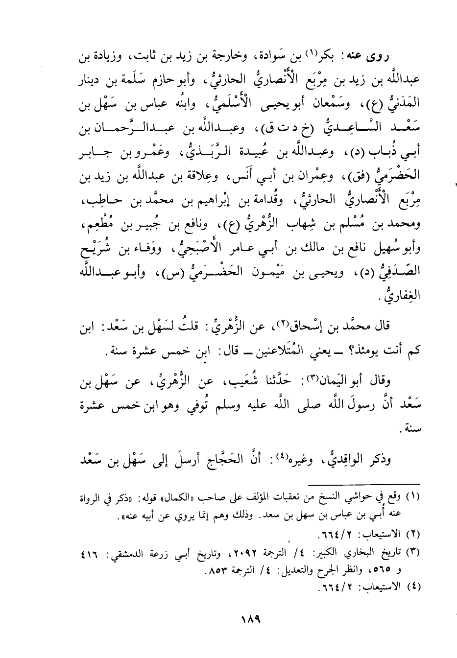 (1) وقع في حواشى النسخ من تعقبات المؤلف على صاحب "الكمال" قوله: ذكر في الرواة عنه أبي بْن عباس بْن سهل بن سعد.