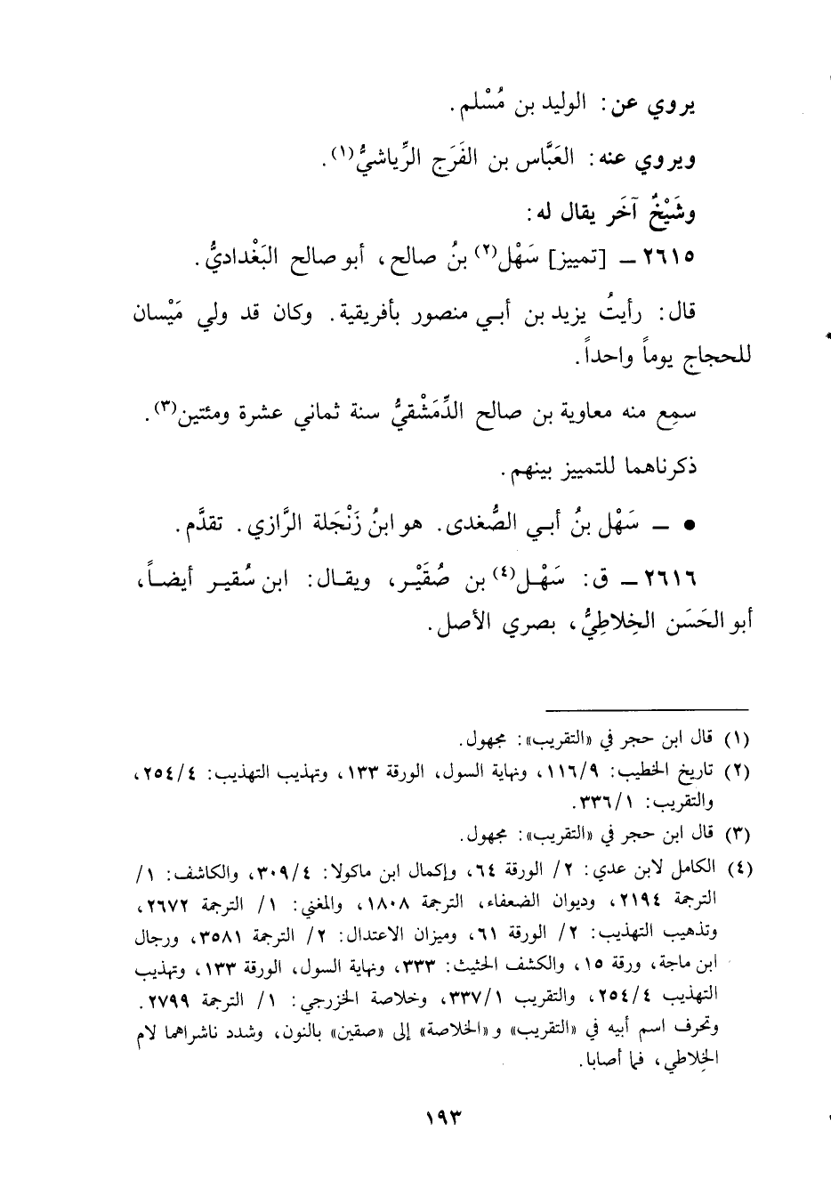 2616 - ق: سهل بن صقير (4) ، ويُقال: ابن سقير أيضا، أَبُو الحسن الخلاطي، بصري الأصل.
