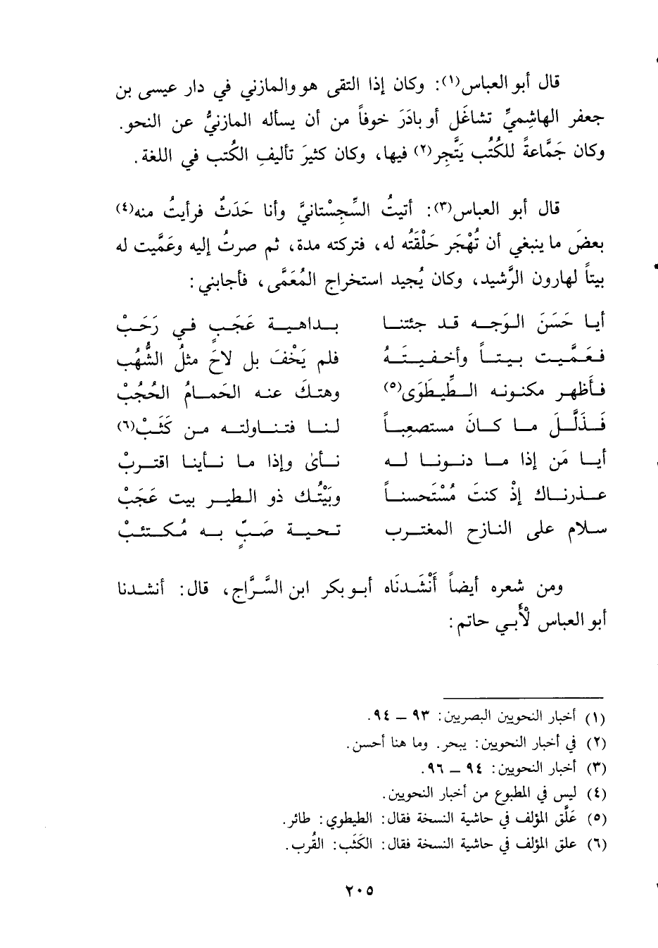 ومن شعره أيضا أنشدناه أبو بَكْرِ بْنُ السراج، قال: أنشدنا أَبُو العباس لأَبِي حاتم: