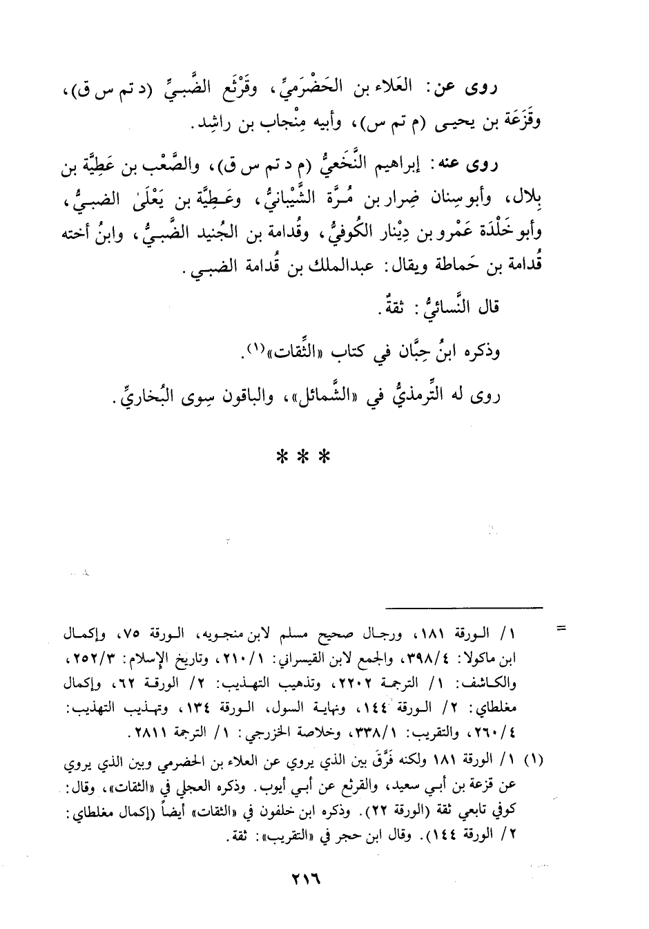 = 1 / الورقة 181، ورجال صحيح مسلم لابن منجويه، الورقة 75، وإكمال ابن ماكولا: 4 / 398، والجمع لابن القيسراني: 1 / 210، وتاريخ الاسلام: 3 / 252، والكاشف: 1 / الترجمة 2202، وتذهيب التهذيب: 2 / الورقة 62، وإكمال مغلطاي: 2 / الورقة 144، ونهاية السول، الورقة 134، وتهذيب التهذيب: 4 / 260، والتقريب: 1 / 338، وخلاصة الخزرجي: 1 / الترجمة 2811.
