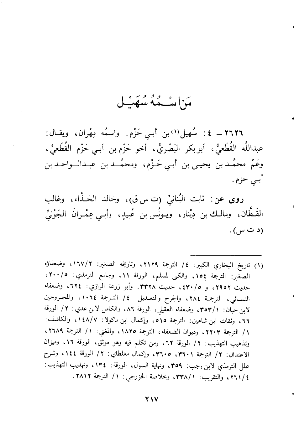 2626 - 4: سهيل بن أَبي حزم (1) . واسمه مهران، ويُقال: عَبد اللَّهِ القطعي، أبو بَكْر البَصْرِيّ، أخو حزم بْن أَبي حزم القطعي، وعم مُحَمَّد بْن يحيى بْن أَبي حزم، ومحمد بْن عَبْدِ الْوَاحِدِ بْنِ أَبي حزم.