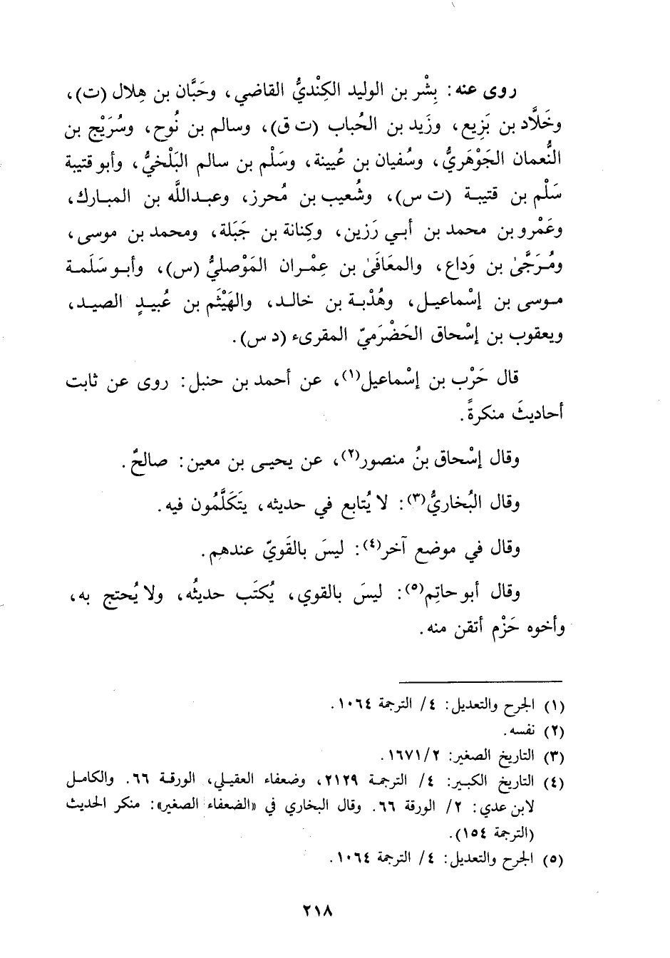 (4) التاريخ الكبير: 4 / الترجمة 2129، وضعفاء العقيلي، الورقة 66. والكامل لابن عدي: 2 / الورقة 66. وقَال البُخارِيُّ في "الضعفاء الصغير": منكر الحديث (الترجمة 154) .