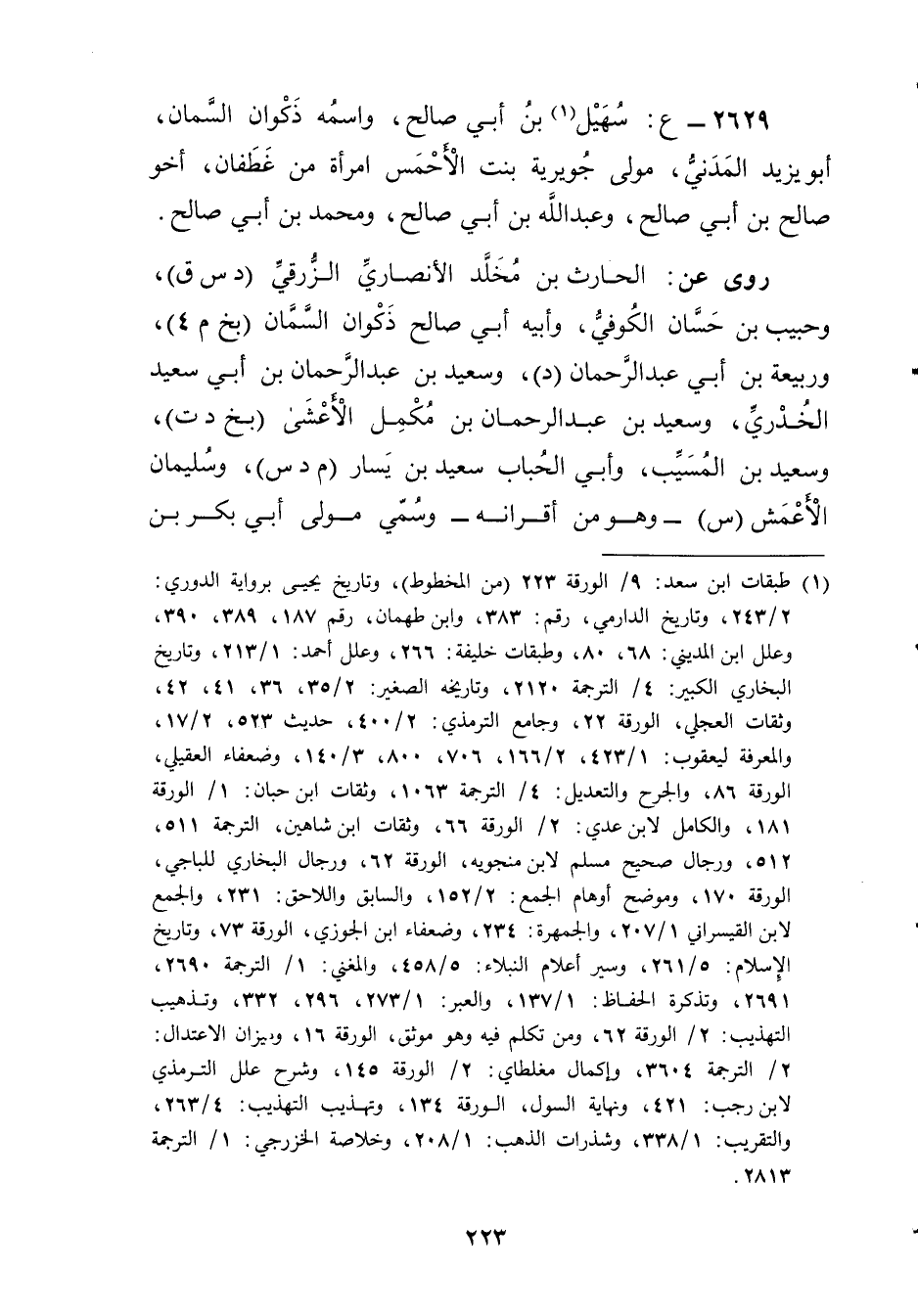 2629 - ع: سهيل بن أَبي صالح (1) ، واسمه ذكوان السمان، أَبُو يزيد المدني، مولى جويرية بنت الأحمس امرأة من غطفان، أخو صالح بْن أَبي صالح، وعَبْد اللَّهِ بْن أَبي صَالِح، ومحمد بْن أَبي صالح.