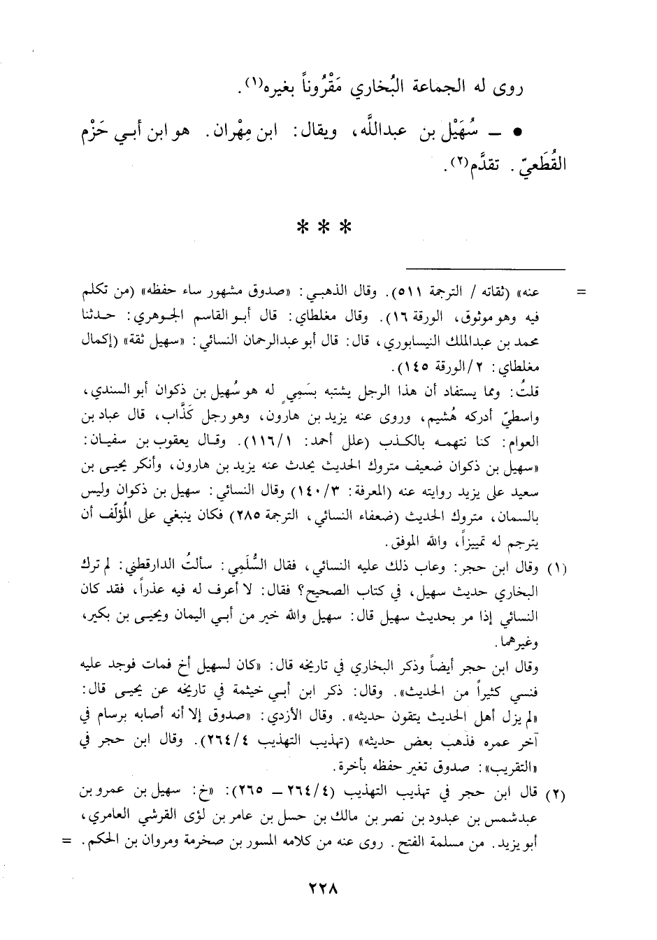 (1) وَقَال ابن حجر: وعاب ذلك عليه النَّسَائي، فقال السلمي: سألت الدارقطني: لم ترك البخاري حديث سهيل، في كتاب الصحيح؟ فقال: لا أعرف له فيه عذرا، فقد كان النَّسَائي إذا مر بحديث سهيل قال: سهيل والله خير من أبي اليمان ويحيى بن بكير، وغيرهما. وَقَال ابن حجر أيضا وذكر البخاري في تاريخه قال: كان لسهيل أخ فمات فوجد عليه فنسي كثيرا من الحديث". وَقَال: ذكر ابن أَبي خيثمة في تاريخه عن يحيى قال: لم يزل أهل الحديث يتقون حديثه". وَقَال الأزدي: صدوق إلا أنه أصابه برسام في آخر عُمَره فذهب بعض حديثه" (تهذيب التهذيب 4 / 264) . وَقَال ابن حجر في "التقريب": صدوق تغير حفظه بأخره.