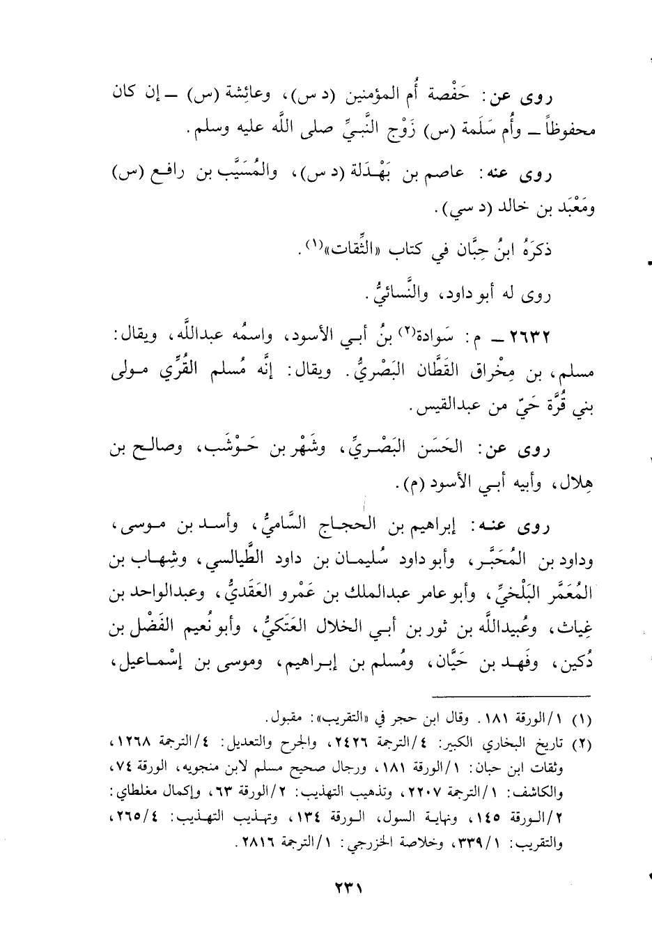 (2) تاريخ البخاري الكبير: 4 / الترجمة 2426، والجرح والتعديل: 4 / الترجمة 1268، وثقات ابن حبان: 1 / الورقة 181، ورجال صحيح مسلم لابن منجويه، الورقة 74، والكاشف: 1 / الترجمة 2207، وتذهيب التهذيب: 2 / الورقة 63، وإكمال مغلطاي: 2 / الورقة 145، ونهاية السول، الورقة 134، وتهذيب التهذيب: 4 / 265، والتقريب: 1 / 339، وخلاصة الخزرجي: 1 / الترجمة 2816.