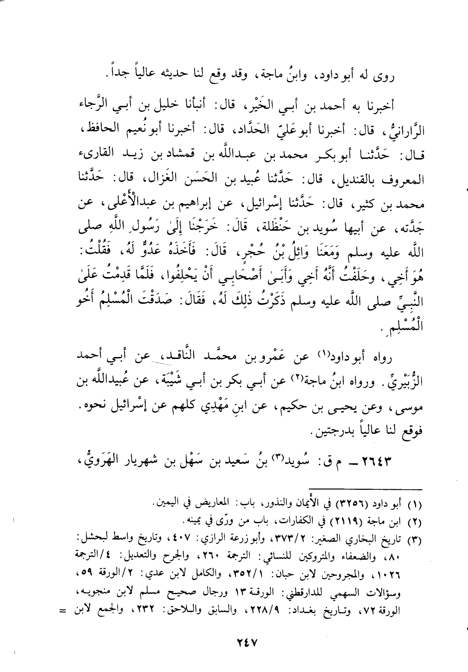 أخبرنا بِهِ أَحْمَدُ بْنُ أَبي الْخَيْرِ، قال: أَنْبَأَنَا خَلِيلُ بْنُ أَبي الرَّجَاءِ الرَّارَانِيُّ، قال: أَخْبَرَنَا أَبُو عَلِيّ الحداد، قال: أَخْبَرَنَا أبو نعيم الحافظ، قال: حَدَّثَنَا أَبُو بَكْر مُحَمَّد بْن عَبد اللَّهِ بْنِ قَمْشَادَ بْنِ زَيْدٍ الْقَارِئُ، الْمَعْرُوفُ بِالْقَنْدِيلِ، قال: حَدَّثَنَا عُبَيد بْنُ الْحَسَنِ الْغَزَّالُ، قال: حَدَّثَنَا مُحَمَّدُ بْنُ كَثِيرٍ، قال: حَدَّثَنَا إِسْرَائِيلُ، عَنْ إِبْرَاهِيمَ بن عبد الاعلى، عَنْ جدته، عَن أبيها سويد بْنِ حَنْظَلَةَ، قال: خَرَجْنَا إِلَى رَسُول اللَّهِ صلى الله عليه وسَلَّمَ ومَعَنَا وائِلُ بْنُ حَجَرٍ، قال: فَأَخَذَهُ عَدُوٌ لَهُ، فَقُلْتُ: هُوَ أَخِي، وحَلَفْتُ أَنَّهُ أَخِي وأَبَى أَصْحَابِي أَنْ يَحْلِفُوا، فَلَمَّا قَدِمْتُ عَلَى النَّبِيِّ صَلَّى اللَّهُ عَلَيْهِ وسَلَّمَ ذَكَرْتُ ذَلِكَ لَهُ، فَقال: صَدَقْتَ الْمُسْلِمُ أَخُو الْمُسْلِمُ.
