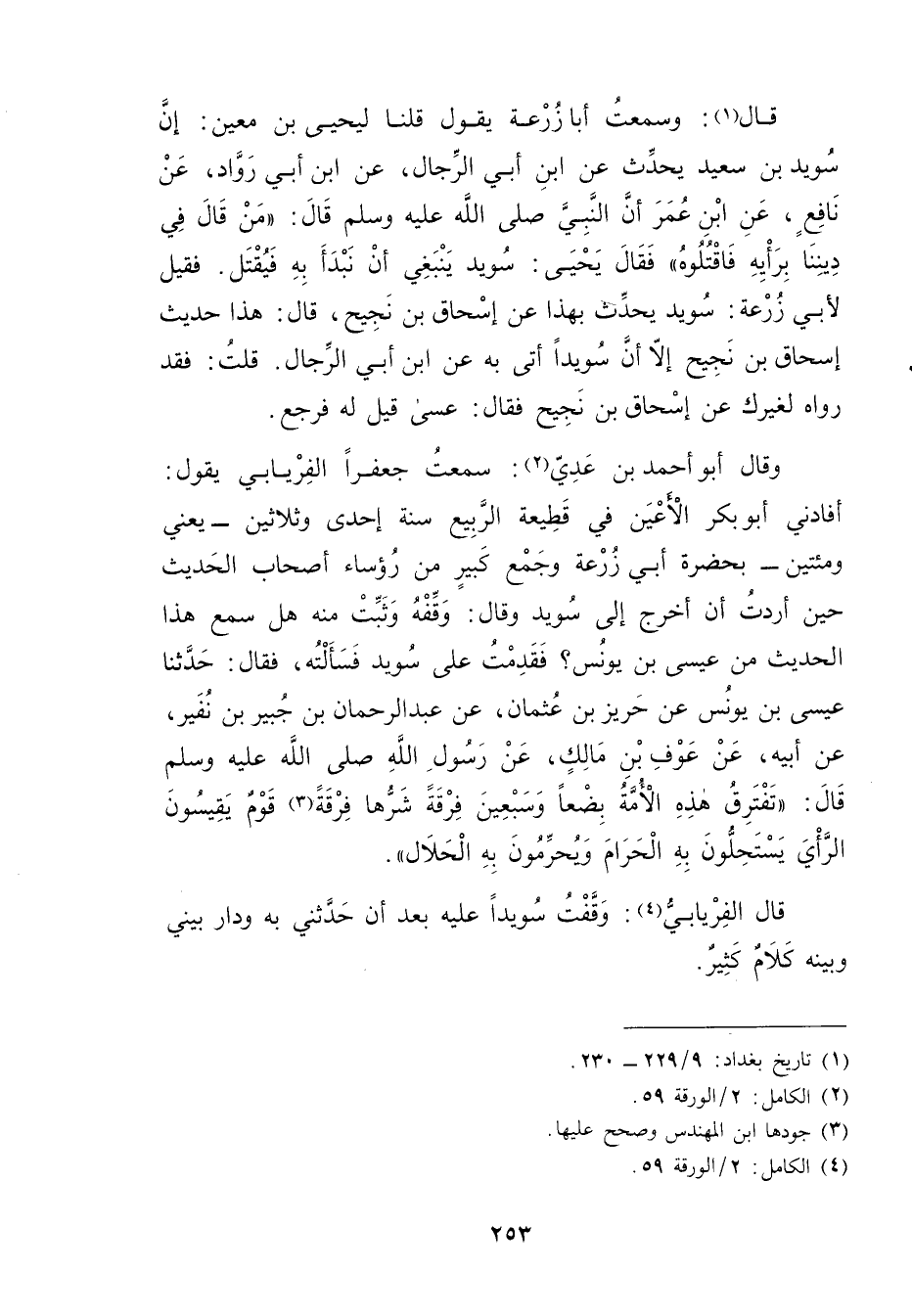 وَقَال أَبُو أَحْمَدَ بْنُ عَدِيٍّ (2) : سَمِعْتُ جَعْفَرًا الْفِرْيَابِيَّ يَقُولُ: أَفَادَنِي أَبُو بَكْرٍ الأَعْيَنُ فِي قَطِيعَةِ الرَّبِيعِ سَنَةَ إِحْدَى وثَلاثِينَ، يعني ومئتين - بِحَضْرَةِ أَبِي زُرْعَةَ وجَمْعٍ كَبِيرٍ مِنْ رُؤَسَاءِ أَصْحَابِ الْحَدِيثِ حِينَ أَرَدْتُ أَنْ أَخْرُجَ إِلَى سُوَيْدٍ وَقَال: وقِّفْهُ وثَبِّتْ مِنْهُ هَلْ سَمِعَ هَذَا الْحَدِيثَ مِنْ عِيسَى بْنِ يُونُسَ؟ فَقَدِمْتُ عَلَى سُوَيْدٍ فَسَأَلْتُهُ، فَقال: حَدَّثَنَا عِيسَى بْنُ يُونُسَ عَنْ حَرِيزِ بْنِ عُثْمَانَ، عَنْ عَبْدِ الرَّحْمَنِ بْنِ جُبَيْرِ بْنِ نَفِيرٍ، عَن أَبِيهِ، عَنْ عَوْفِ بْنِ مَالِكٍ، عَنْ رَسُولِ اللَّهِ صلى الله عليه وسلم قال: تَفْتَرِقُ هَذِهِ الأُمَّةُ بِضْعًا وسَبْعِينَ فِرْقَةً شَرُّهَا فِرْقَةُ (3) قَوْمٍ يَقِيسُونَ الرَّأْيَ يَسْتَحِلُّونَ بِهِ الْحَرَامَ ويُحَرِّمُونَ بِهِ الْحَلالَ.