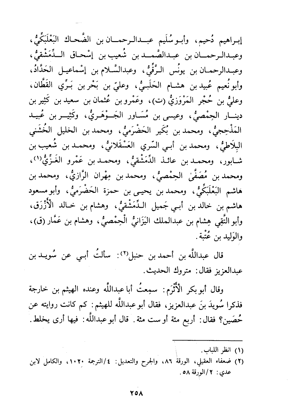 (2) ضعفاء العقيلي، الورقة 86، والجرح والتعديل: 4 / الترجمة 1020، والكامل لابن عدي: 2 / الورقة 58.
