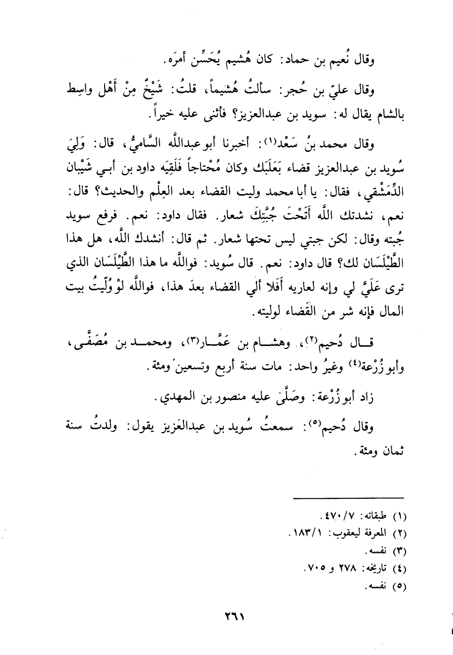 وَقَال مُحَمَّد بن سعد (1) : أَخْبَرَنَا أَبُو عَبْد اللَّهِ السامي، قال: ولي سويد بْن عَبْد العزيز قضاء بعلبك وكَانَ محتاجا فلقيه داود بْن أَبي شيبان الدمشقي، فقال: يا أبا مُحَمَّد وليت القضاء بعد العلم والحديث؟ قال: نعم، نشدتك الله أتحت جبتك شعار. فقال داود: نعم. فرفع سويد جبته وَقَال: لكن جبتي ليس تحتها شعار. ثم قال: أنشدك اللَّه، هل هذا الطيلسان لك؟ قال داود: نعم. قال سويد: فو الله ما هذا الطيلسان الذي ترى علي لي وإنه لعاريه أفلا ألي القضاء بعد هذا، فو الله لو وليت بيت المال فإنه شر من القضاء لوليته.