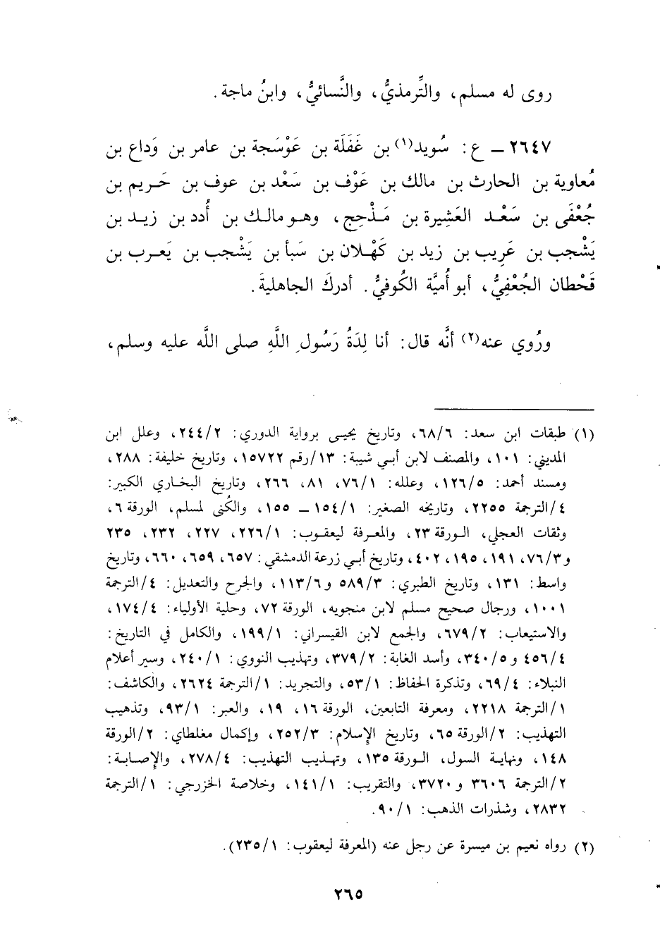 2647 - ع: سويد بن غفلة بن عوسجة بن عامر بن وداع بْن معاوية بْن الحارث بْن مَالِك بن عوف بن سعد بن عوف بن حريم بن جعفى بن سعد العشيرة بن مذحج (1) ، وهو مَالِك بْن ادد بْن زيد بْن يشجب بْن عريب بْن زيد بْن كهلان بْن سبأ بْن يشجب بْن يعرب بْن قحطان الجعفي، أَبُو أمية الكوفي. أدرك الجاهلية.