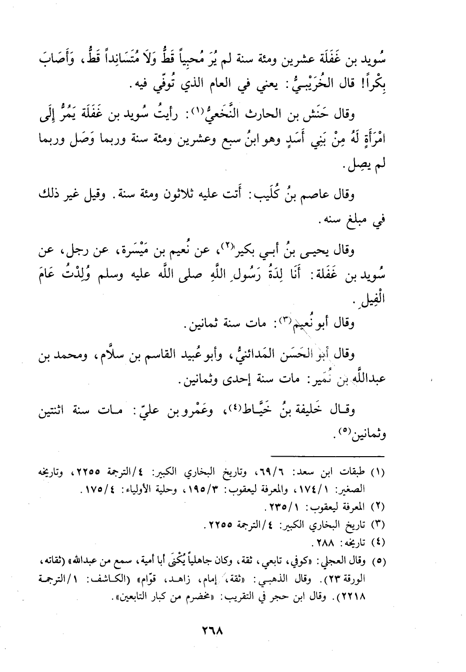 سويد بن غفلة عشرين ومئة سنة لم ير محبيا قط ولا متساندا قط، واصاب بكرا! قال الخريبي: يعني فِي العام الذي توفي فيه.