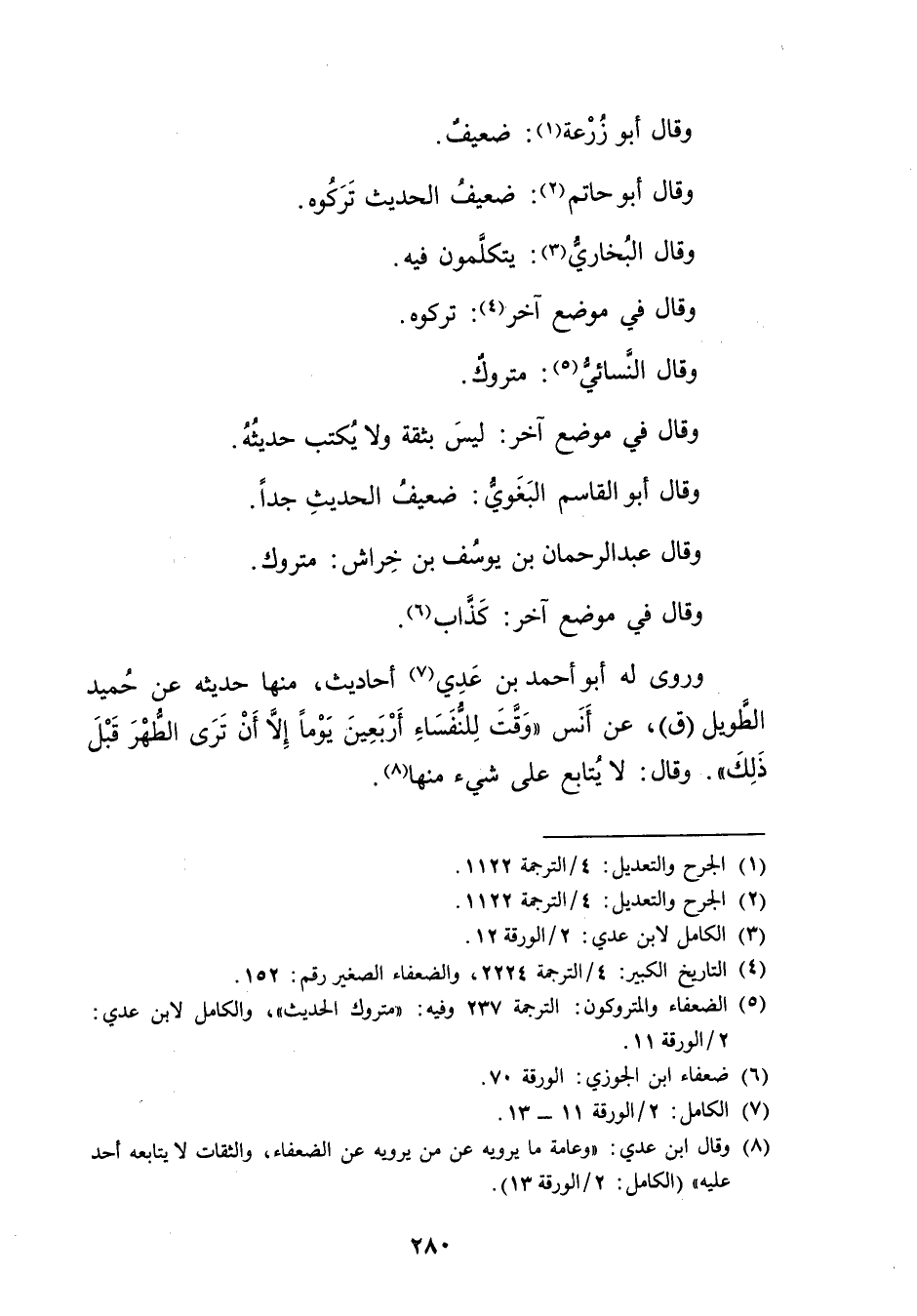 (5) الضعفاء والمتركون: الترجمة 237 وفيه: متروك الحديث"، والكامل لابن عدي: 2 / الورقة 11.