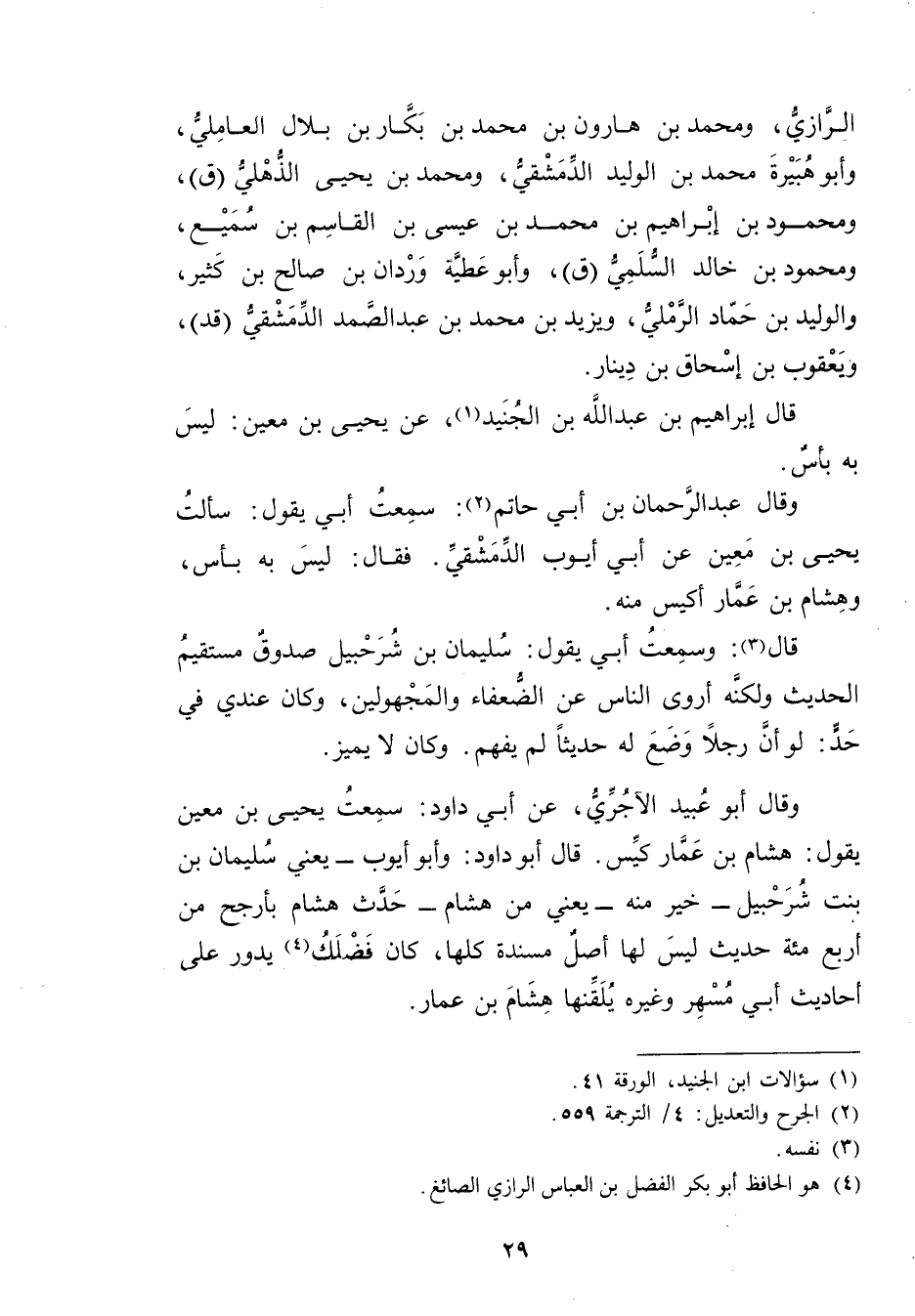 وَقَال عَبْد الرَّحْمَنِ بْن أَبي حَاتِم (2) : سمعت أَبِي يَقُول: سألت يحيى بْن مَعِين عَن أبي أيوب الدمشقي. فقال: ليس به بأس، وهشام بْن عمار أكيس منه.
