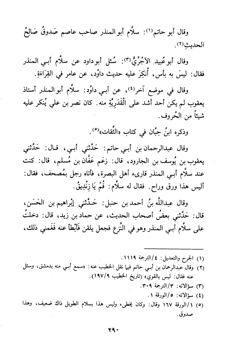وَقَال فِي موضع آخر (4) ، عَن أبي داود: سلام أَبُو المنذر أستاذ يعقوب لم يكن أحد أشد على القدرية منه. كَانَ نصر بْن علي ينكر عليه شيئاً من الحروف.