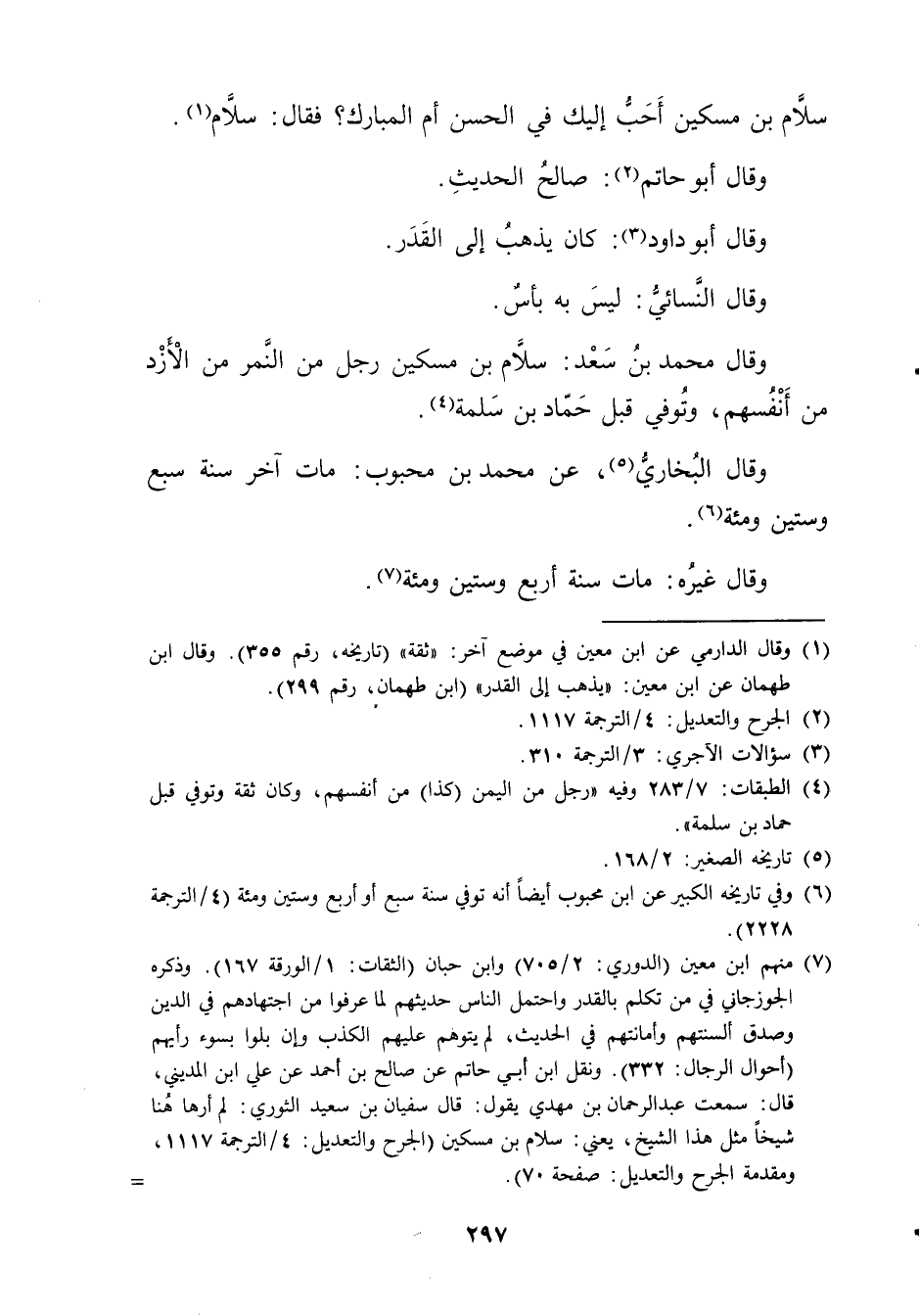 (7) منهم ابن مَعِين (الدوري: 2 / 705) وابن حبان (الثقات: 1 / الورقة 167) ، وذَكَره الجوزجاني في من تكلم بالقدر واحتمل الناس حديثهم لما عرفوا من اجتهادهم في الدين وصدق ألسنتهم وأمانتهم في الحديث، لم يتوهم عليهم الكذب وإن بلوا بسوء رأيهم (أحوال الرجال: 332) . ونقل ابن أَبي حاتم عن صالح بن أحمد عن علي ابن المديني، قال: سمعت عبد الرحمن بن مهدي يقول: قال سفيان بن سَعِيد الثوري: لم أرها هنا شيخا مثل هذا الشيخ، يعني: سلام بن مسكين (الجرح والتعديل: 4 / الترجمة 1117، ومقدمة الجرح والتعديل: صفحة 70) . =