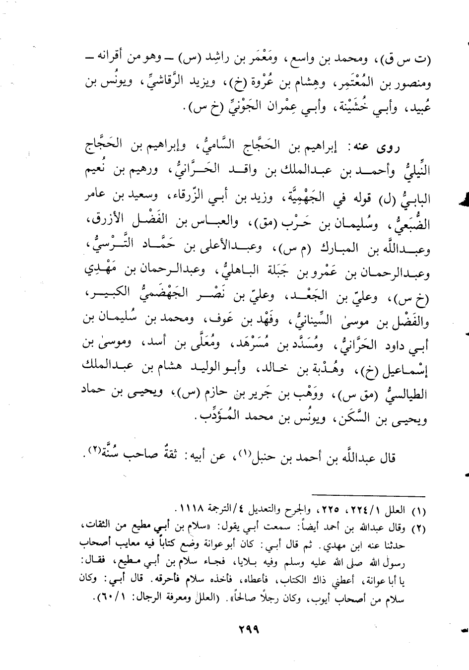 (2) وَقَال عَبد اللَّهِ بْن أَحْمَد أيضا: سمعت أبي يقول: سلام بن أَبي مطيع من الثقات، حَدَّثَنَا عنه ابن مهدي. ثم قال أبي: كان أبو عوانة وضع كتابا فيه معايب أصحاب رَسُول اللَّهِ صلى الله عليه وسلم وفيه بلايا، فجاء سلام بن أَبي مطيع، فقال: يا أبا عوانة، أعطني ذاك الكتاب، فأعطاه، فأخذه سلام فأحرقه. قال أبي: وكان سلام من أصحاب أيوب، وكان رجلا صالحا". (العلل ومعرفة الرجال: 1 / 60) .