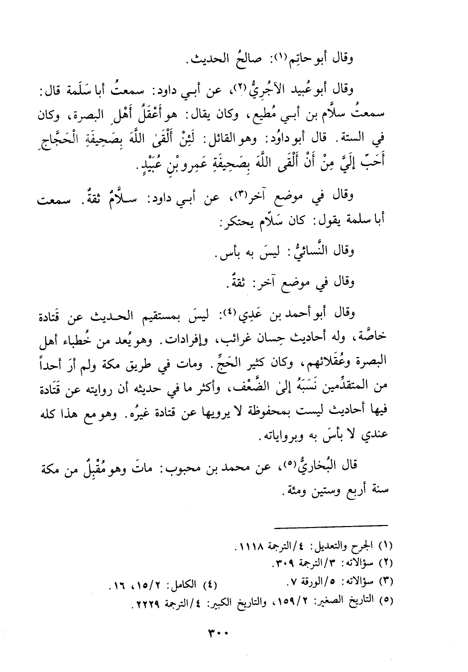 وَقَال أَبُو عُبَيد الأجري (2) ، عَن أبي داود: سمعت أبا سلمة قال: سمعت سلام بْن أَبي مطيع، وكَانَ يقال: هو اعقل أهل البصرة، وكَانَ فِي الستة.