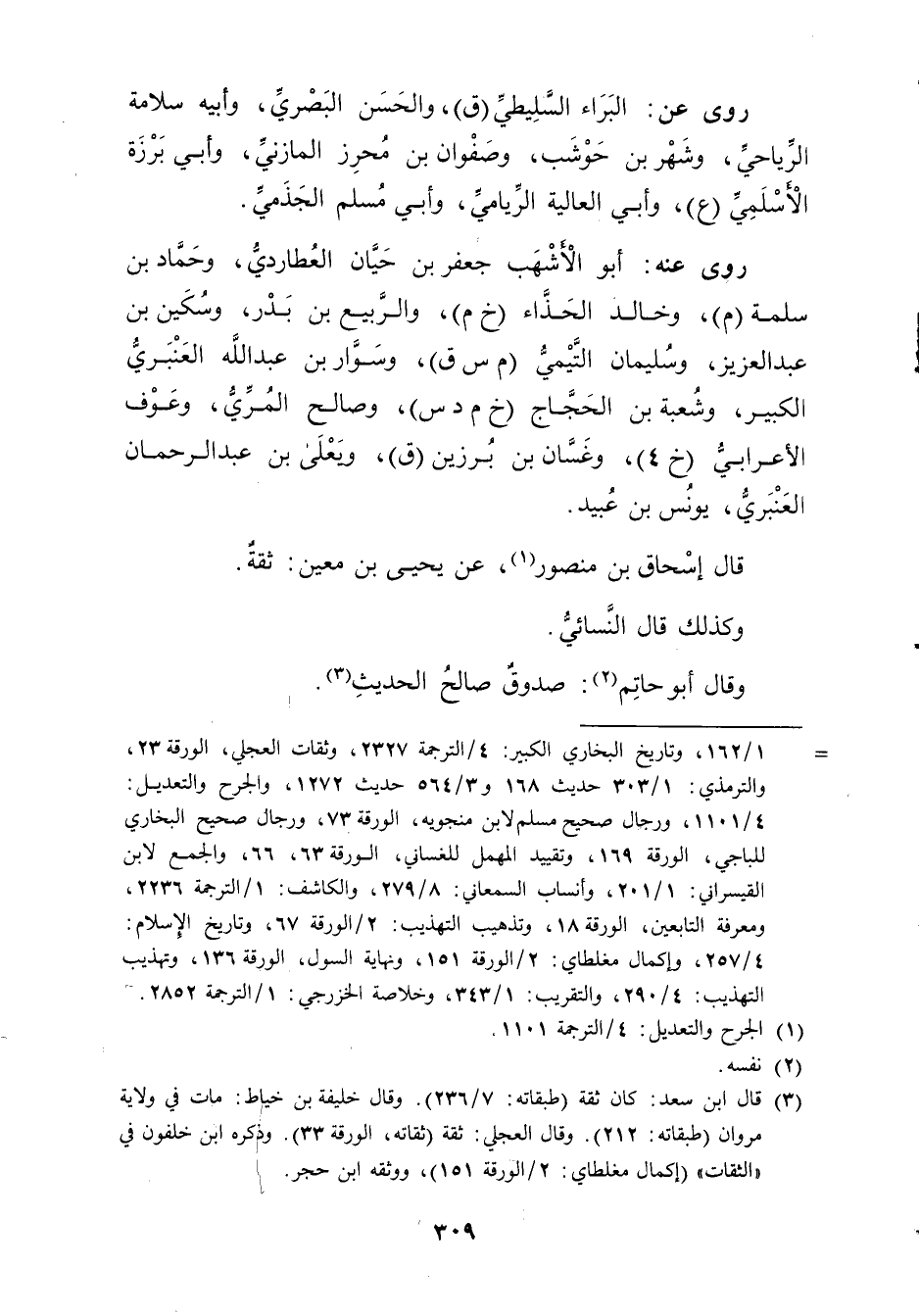 = 1 / 162، وتاريخ البخاري الكبير: 4 / الترجمة 2327، وثقات العجلي، الورقة 23، والتِّرْمِذِيّ: 1 / 303 حديث 168 و3 / 564 حديث 1272، والجرح والتعديل: 4 / 1101، ورجال صحيح مسلم لابن منجويه، الورقة 73، ورجال صحيح البخاري للباجي، الورقة 169، وتقييد المهمل للغساني، الورقة 63، 66، والجمع لابن القيسراني: 1 / 201، وأنساب السمعاني: 8 / 279، والكاشف: 1 / الترجمة 2236، ومعرفة التابعين، الورقة 18، وتذهيب التهذيب: 2 / الورقة 67، وتاريخ الاسلام: 4 / 257، وإكمال مغلطاي: 2 / الورقة 151، ونهاية السول، الورقة 136، وتهذيب التهذيب: 4 / 290، والتقريب: 1 / 343، وخلاصة الخزرجي: 1 / الترجمة 2852.
