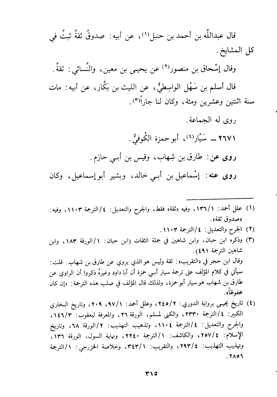 (3) وذكره ابنُ حِبَّان، وابن شاهين في جملة الثقات (ابن حبان: 1 / الورقة 183، وابن شاهين الترجمة 491) . وَقَال ابن حجر في "التقريب": ثقة وليس هو الذي يروي عن طارق بن شهاب. قلت: سيأتي في كلام المؤلف على ترجمة سيار أبي حمزة أن أبا داود وغيره ذكروا أن الراوي عن طارق بن شهاب هو سيار أبو حمزة، ولذلك قال المؤلف في صلب هذه الترجمة: إن كان محفوظا.
