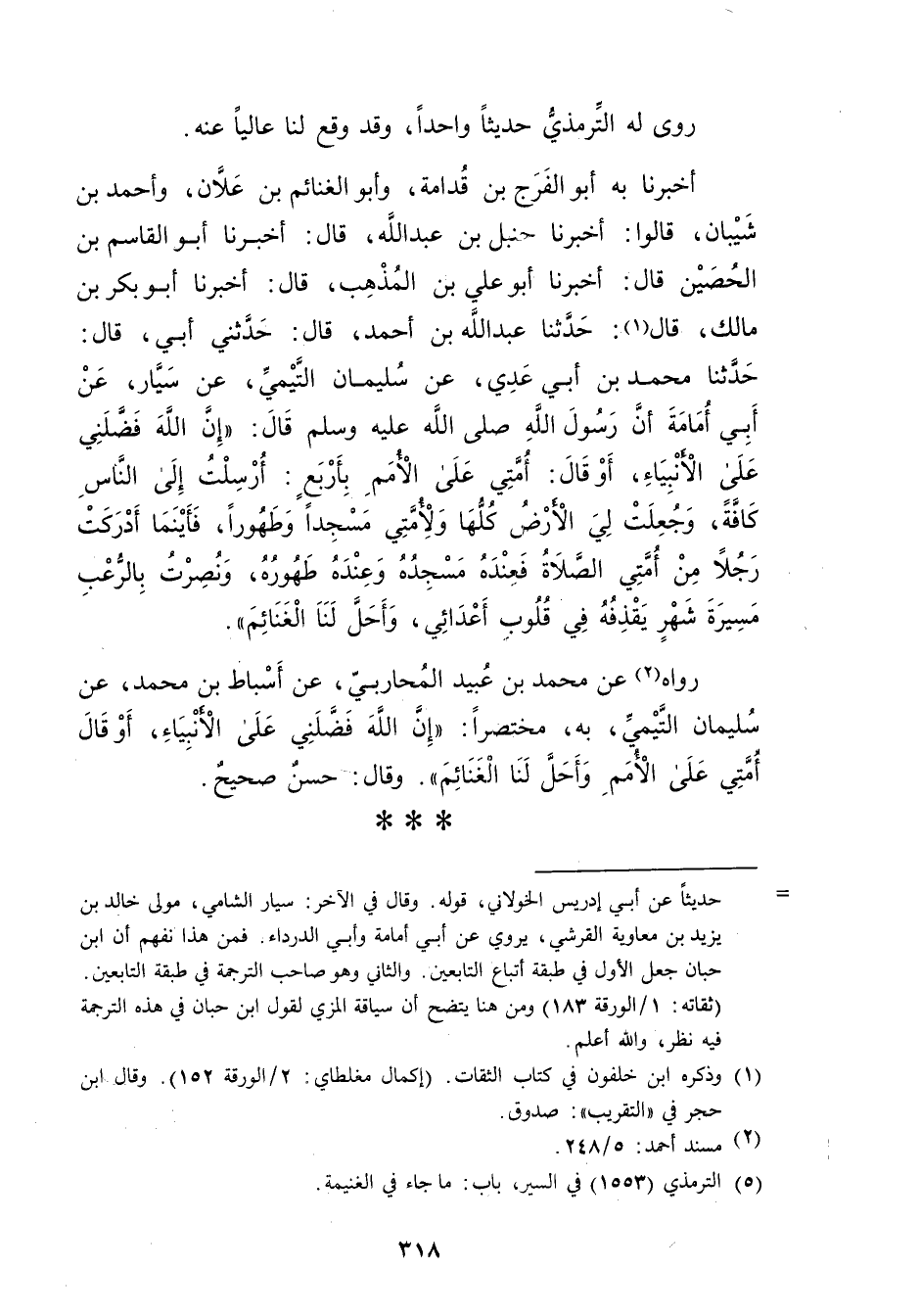 أَخْبَرَنَا بِهِ أَبُو الْفَرَجِ بْنُ قُدَامَةَ، وأَبُو الْغَنَائِمِ بْنُ عَلانَ، وأَحْمَدُ بْنُ شَيْبَانَ، قَالُوا: أَخْبَرَنَا حنبل بْن عَبد الله، قال: أَخْبَرَنَا أبو القاسم بْن الحصين قال: أَخْبَرَنَا أَبُو علي بْن المذاهب، قال: أَخْبَرَنَا أبو بكر بْن مالك، قال (1) : حَدَّثَنَا عَبد الله بْن أَحْمَدَ، قال: حَدَّثني أبي، قال: حَدَّثَنَا مُحَمَّدُ بْنُ أَبي عَدِيٍّ، عَنْ سُلَيْمان التَّيْمِيّ، عَنْ سَيَّارٍ، عَن أَبِي أُمَامَةَ أَنَّ رَسُول اللَّهِ صلى الله عليه وسَلَّمَ قال: إِنَّ اللَّهَ فَضَّلَنِي عَلَى الأَنْبِيَاءِ، أَوْ قال: أُمَّتِي عَلَى الأُمَمِ بِأَرْبَعٍ: أُرْسِلْتُ إِلَى النَّاسِ كَافَّةً، وجُعِلَتْ لِي الأَرْضُ كُلُّهَا ولأُمَّتِي مَسْجِدًا وطَهُورًا، فَأَيْنَمَا أَدْرَكَتْ رَجُلا مِنْ أُمَّتِي الصَّلاةُ فَعِنْدَهُ مَسْجِدُهُ وعِنْدَهُ طَهُورُهُ، ونُصِرْتُ بِالرُّعْبِ مَسِيرَةَ شَهْرٍ يَقْذِفُهُ فِي قُلُوبِ أَعْدَائِي، وأَحَلَّ لَنَا الْغَنَائِمَ.