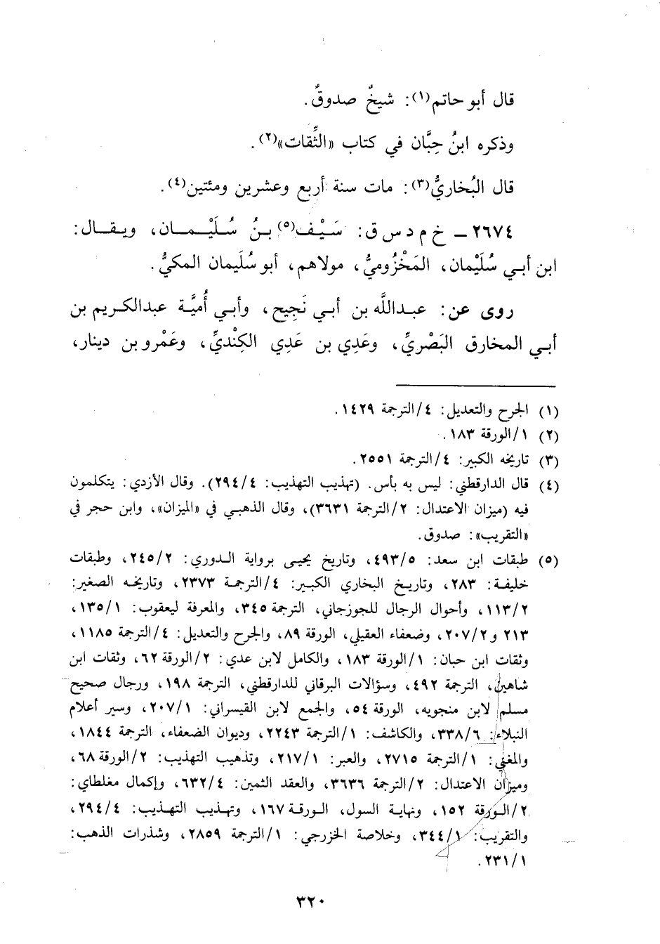 (5) طبقات ابن سعد: 5 / 493، وتاريخ يحيى برواية الدوري: 2 / 245، وطبقات خليفة: 283، وتاريخ البخاري الكبير: 4 / الترجمة 2373، وتاريخه الصغير: 2 / 113، وأحوال الرجال للجوزجاني، الترجمة 345، والمعرفة ليعقوب: 1 / 135، 213 و2 / 207، وضعفاء العقيلي، الورقة 89، والجرح والتعديل: 4 / الترجمة 1185، وثقات ابن حبان: 1 / الورقة 183، والكامل لابن عدي: 2 / الورقة 62، وثقات ابن شاهين، الترجمة 492، وسؤالات البرقاني للدارقطني، الترجمة 198، ورجال صحيح مسلم لابن منجويه، الورقة 54، والجمع لابن القيسراني: 1 / 207، وسير أعلام النبلاء: 6 / 338، والكاشف: 1 / الترجمة 2243، وديوان الضعفاء، الترجمة 1844، والمغني: 1 / الترجمة 2715، والعبر: 1 / 217، وتذهيب التهذيب: 2 / الورقة 68، وميزان الاعتدال: 2 / الترجمة 3636، والعقد الثمين: 4 / 632، وإكمال مغلطاي: 2 / الورقة 152، ونهاية السول، الورقة 167، وتهذيب التهذيب: 4 / 294، والتقريب: 1 / 344، وخلاصة الخزرجي: 1 / الترجمة 2859، وشذرات الذهب: 1 / 231.