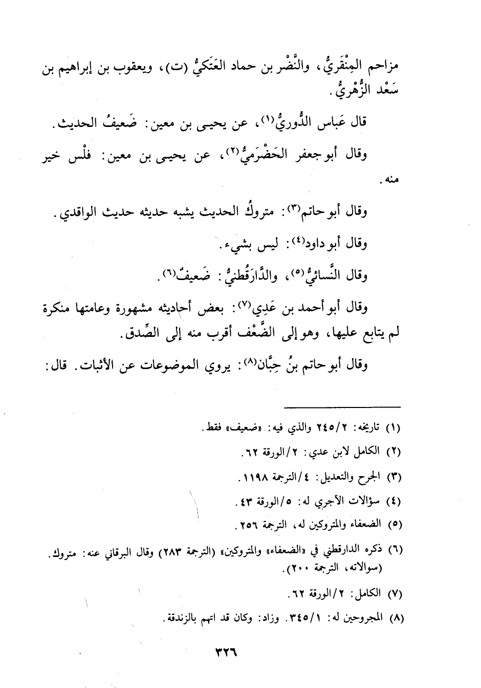 (6) ذكره الدارقطني في "الضعفاء"والمتروكين" (الترجمة 283) وَقَال البرقاني عَنه: متروك. (سوالاته، الترجمة 200) .