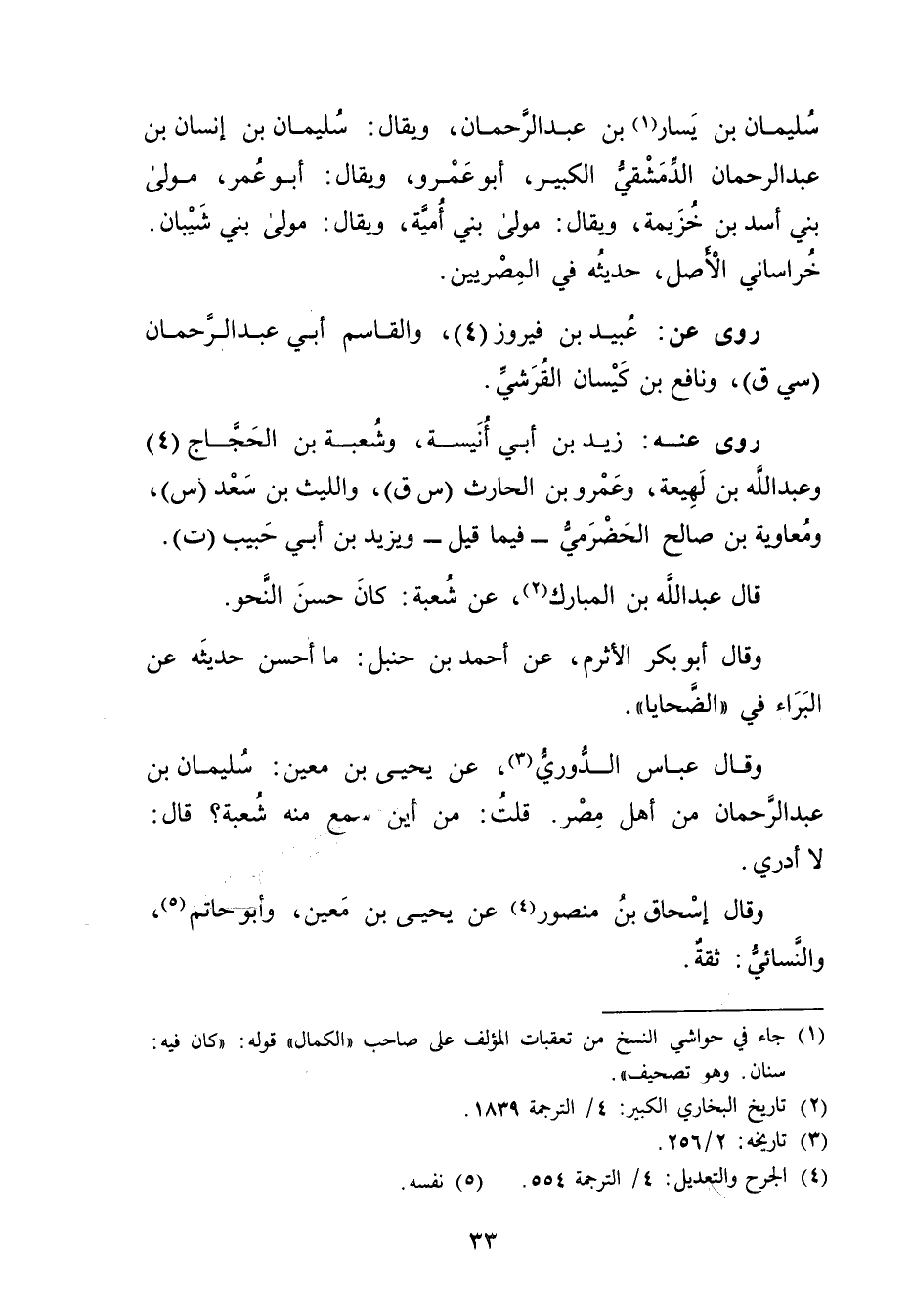 وَقَال عَباس الدُّورِيُّ (3) ، عَنْ يحيى بْن مَعِين: سُلَيْمان بْن عَبْد الرحمن من أهل مصر. قلت: من أين سمع منه شعبة؟ قال: لاأدري.
