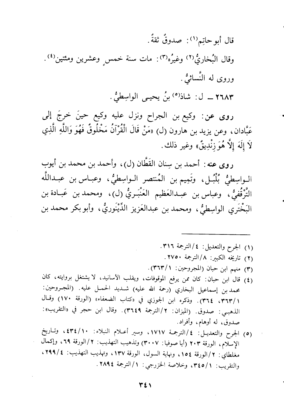 (5) الجرح والتعديل: 4 / الترجمة 1717، وسير أعلام النبلاء: 10 / 434، وتاريخ الاسلام، الورقة 203 (أيا صوفيا: 3007) وتذهيب التهذيب: 2 / الورقة 69، وإكمال مغلطاي: 2 / الورقة 154، ونهاية السول، الورقة 137، وتهذيب التهذيب: 4 / 299، والتقريب: 1 / 345، وخلاصة الخزرجي: 1 / الترجمة 2894.