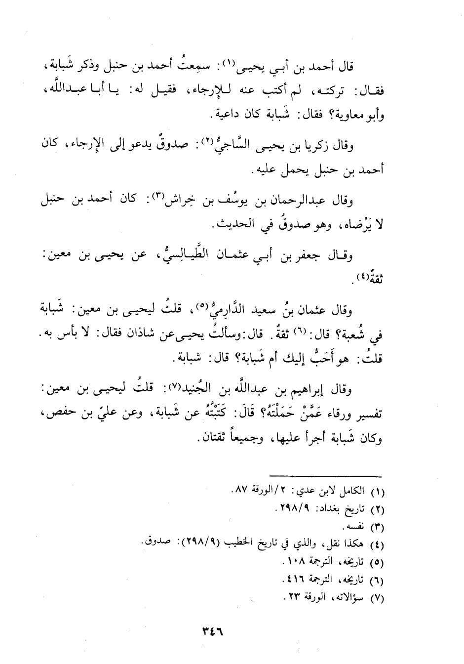 وَقَال إبراهيم بْن عَبد اللَّهِ بْن الجنيد (7) : قلت ليحيى بْن مَعِين: تفسير ورقاء عمن حملته؟ قال: كتبته عَنْ شبابة، وعن علي بْن حفص، وكَانَ شبابة أجرأ عليها، وجميعا ثقتان.
