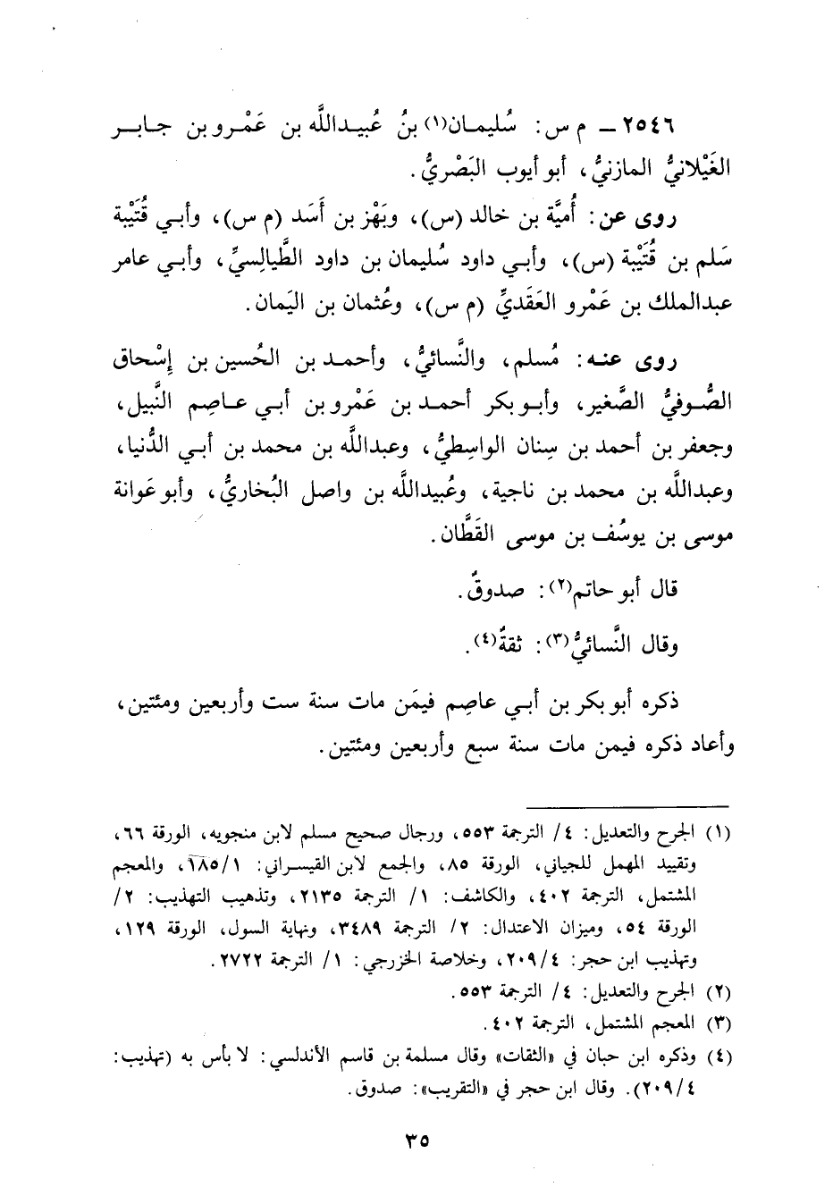 (1) الجرح والتعديل: 4 / الترجمة 553، ورجال صحيح مسلم لابن منجويه، الورقة 66، وتقييد المهمل للجياني، الورقة 85، والجمع لابن القيسراني: 1 / 185، والمعجم المشتمل، الترجمة 402، والكاشف: 1 / الترجمة 2135، وتذهيب التهذيب: 2 / الورقة 54، وميزان الاعتدال: 2 / الترجمة 3489، ونهاية السول، الورقة 129، وتهذيب ابن حجر: 4 / 209، وخلاصة الخزرجي: 1 / الترجمة 2722.