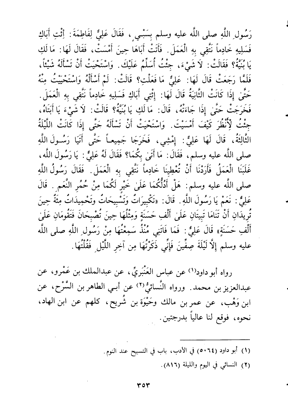 قال: تَكْبِيرَاتٌ وتسبيحات وتحميدات مئة حِينَ تُرِيدَانِ أَنْ تَنَامَا تَبِيتَانِ عَلَى أَلْفِ حَسَنَةٍ ومِثْلُهَا حِينَ تُصْبِحَانِ فَتَقُومَانِ عَلَى أَلْفِ حَسَنَةٍ"قال عَلِيٌّ: فَمَا فَاتَنِي مُنْذُ سَمِعْتُهَا مِنْ رَسُولِ اللَّهِ صَلَّى اللَّهُ عَلَيْهِ وسَلَّمَ إِلا لَيْلَةَ صِفِّينَ فَإِنِّي ذَكَرْتُهَا مِنْ آخِرِ اللَّيْلِ فَقُلْتُهَا.