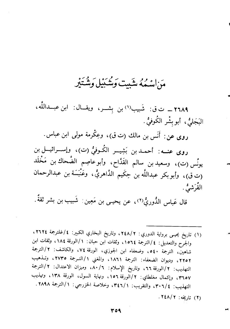 2689 - ت ق: شبيب بن بشر (1) ، ويُقال: ابن عَبد اللَّهِ، البجلي، أَبُو بشر الكوفي.