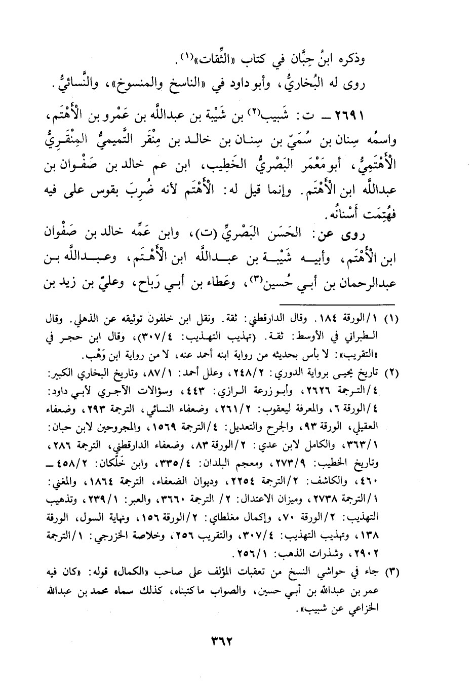 2691 - ت: شبيب بن شَيْبَة بن عَبد اللَّهِ بْن عَمْرو بْن الاهتم (2) ، واسمه سنان بْن سمي بْن سنان بْن خالد بْن منقر التميمي المنقري الاهتمي، أَبُو معمر البَصْرِيّ الخطيب، ابْن عم خالد بْن صفوان بْن عَبد اللَّهِ بْن الأهتم. وإنما قيل له: الأهتم لأنه ضرب بقوس على فيه فهتمت أسنانه.