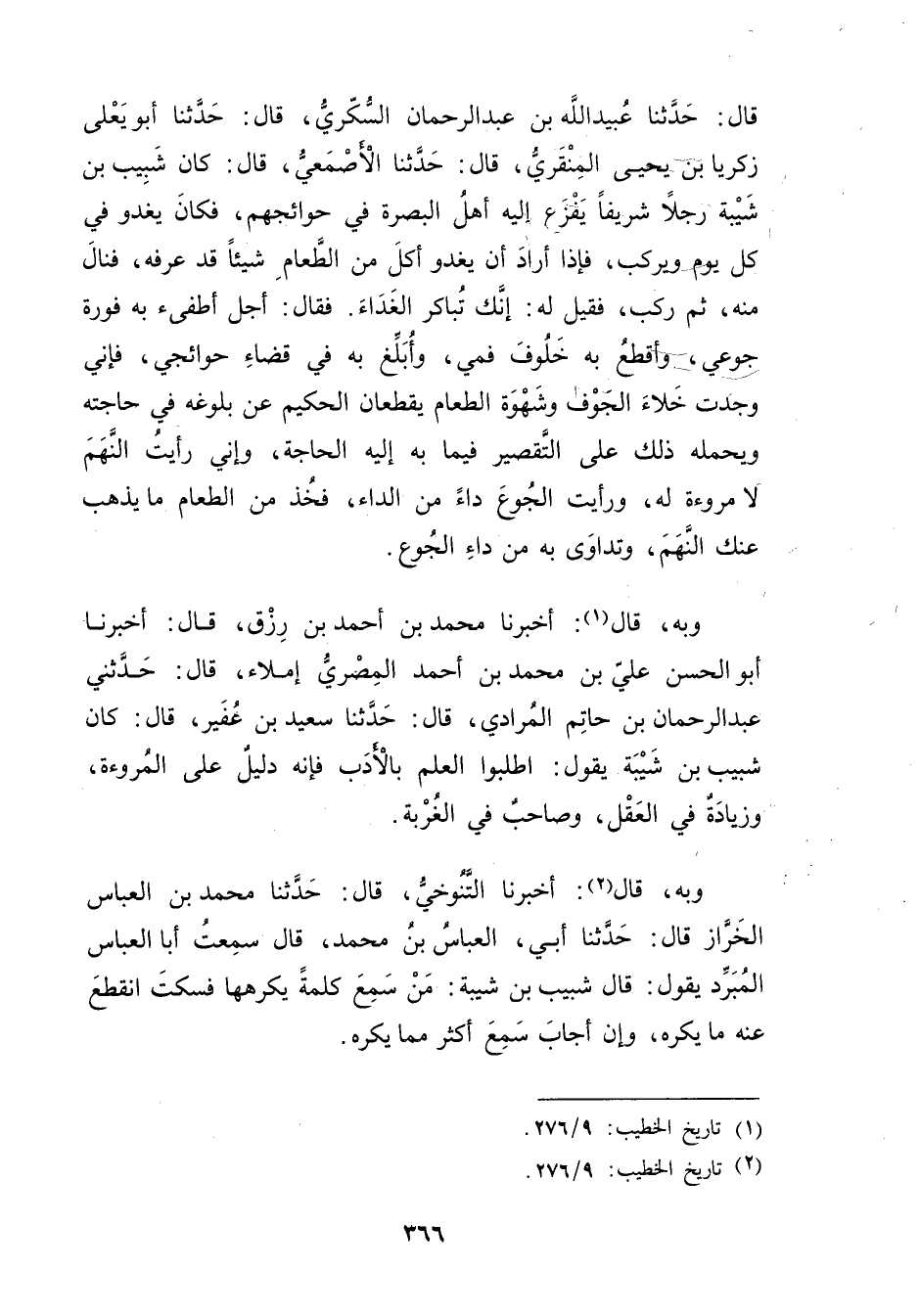 قال: حَدَّثَنَا عُبَيد اللَّهِ بْن عَبْد الرحمن السكري، قال: حَدَّثَنَا أَبُو يَعْلَى زَكَرِيَّا بْن يحيى المنقري، قال: حَدَّثَنَا الأَصْمَعِيّ، قال: كَانَ شبيب بْن شَيْبَة رجلا شريفا يفزع إليه أهل البصرة فِي حوائجهم، فكان يغدو فِي كل يوم ويركب، فإذا أراد أن يغدو أكل من الطعام شيئا قد عرفه، فنال منه، ثم ركب، فقيل له: انك تباكر الغداء. فقال: أجل أطفئ به فورة جوعي، واقطع به خلوف فمي، وأبلغ به فِي قضاء حوائجي، فاني وجدت خلاء الجوف وشهوة الطعام يقطعان الحكيم عَنْ بلوغه فِي حاجته ويحمله ذلك على التقصير فيما به إليه الحاجة، وإني رأيت النهم لا مروءة له، ورأيت الجوع داء من الداء فخذ من الطعام ما يذهب عنك النهم، وتداوي به من داء الجوع.