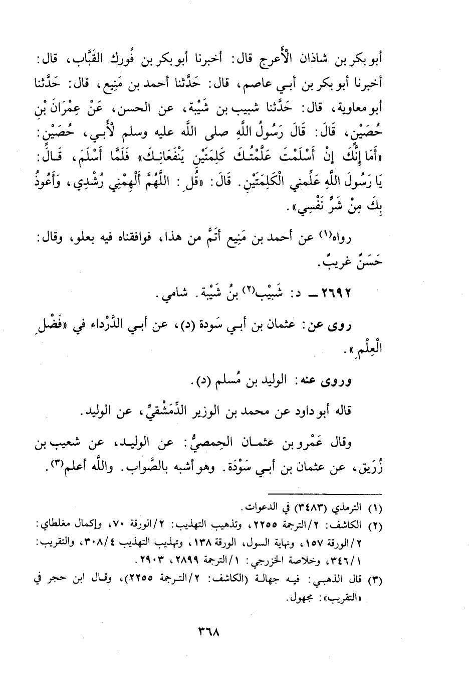 أَبُو بَكْرِ بْنُ شَاذَانَ الأَعْرَجُ قال: أَخْبَرَنَا أبو بكر بْن فُوُرَكَ الْقَبَّابُ، قال: أَخْبَرَنَا أَبُو بَكْرِ بْنُ أَبي عَاصِمٍ، قال: حَدَّثَنَا أَحْمَدُ بْنُ مَنِيعٍ، قال: حَدَّثَنَا أَبُو مُعَاوِيَةَ، قال: حَدَّثَنَا شبيب بْن شَيْبَة، عَنِ الحسن، عَنْ عِمْران بْنِ حُصَيْنٍ، قال: قال رَسُولُ اللَّهِ صلى الله عَلَيْهِ وسَلَّمَ لأَبِي، حصين: أما انك أن أسلمت علمتك كلمتين ينفعانك"فما أسلم، قال: يا رَسُول اللَّه علمني الكلمتين. قال: قل: اللَّهم ألهمني رشدي، وأعوذ بك من شر نفسي.