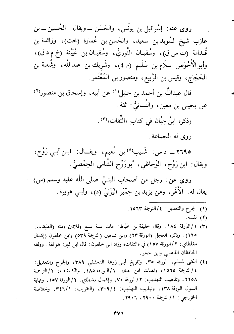 2695 - د س: شبيب بن نعيم (4) ، ويُقال: ابن أَبي روح، ويُقال: ابن روح، الوحاظي، أَبُو روح الشامي الحمصي.
