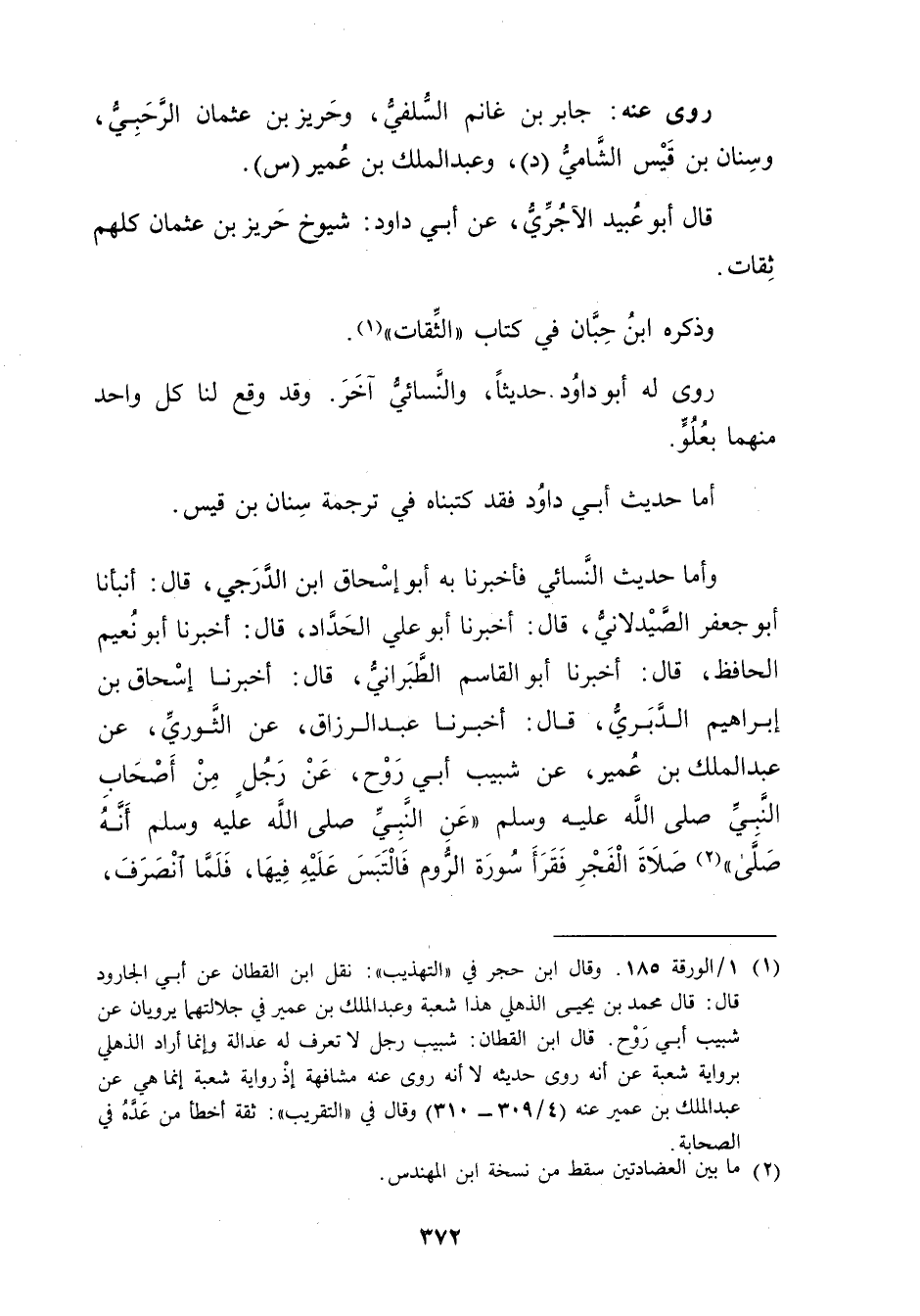 وأما حديث النَّسَائي فَأخبرنا بِهِ أَبُو إِسْحَاقَ ابْنُ الدَّرَجِيِّ، قال: أَنْبَأَنَا أَبُو جَعْفَرٍ الصَّيْدَلانِيُّ، قال: أَخْبَرَنَا أَبُو عَلِيّ الحداد، قال: أَخْبَرَنَا أَبُو نُعَيْمٍ الْحَافِظُ، قال: أَخْبَرَنَا أَبُو الْقَاسِمِ الطَّبَرَانِيُّ، قال: أخبرنا إِسْحَاقُ بْنُ إِبْرَاهِيمَ الدَّبَرِيُّ، قال: أخبرنا عَبْدِ الرَّزَّاقِ، عَنِ الثَّوْرِيِّ، عَنْ عَبد المَلِك بْنِ عُمَير، عَنْ شَبِيبٍ أَبِي رَوْحٍ، عَن رَجُلٍ من أصحاب النَّبِيّ صَلَّى اللَّهُ عَلَيْهِ وسَلَّمَ"عَن النَّبِيِّ صَلَّى اللَّهُ عَلَيْهِ وسَلَّمَ أَنَّهُ صَلَّى" (2) صَلاةَ الْفَجْرِ فَقَرَأَ سُورَةَ الرُّومِ فالْتَبَسَ عَلَيْهِ فِيهَا، فَلَمَّا انْصَرَفَ،
