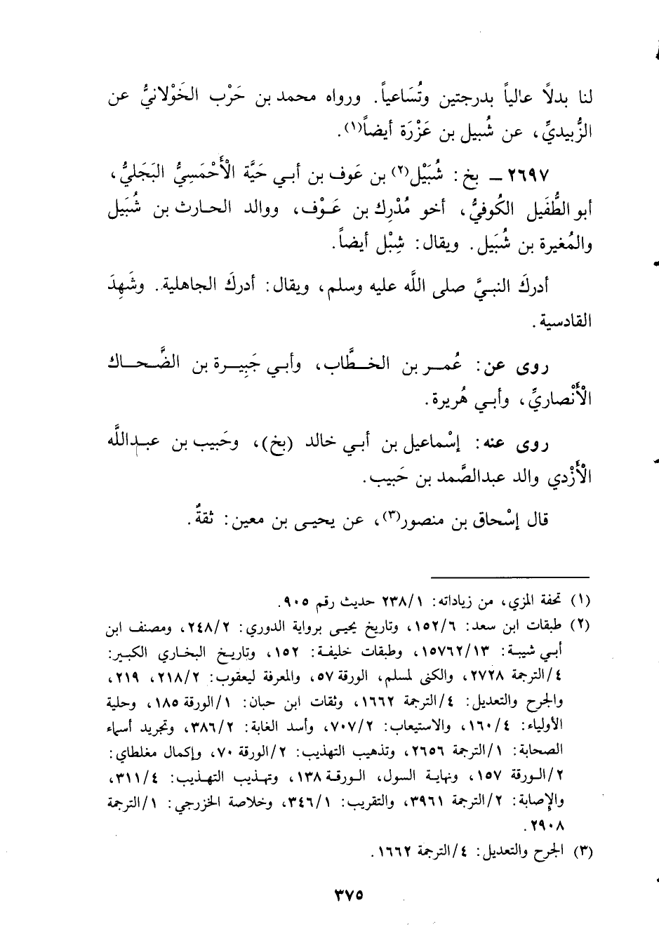 2697 - بخ: شبيل بن عوف بن أَبي حية الأحمسي البجلي (2) ، أَبُو الطفيل الكوفي، أخو مدرك بْن عوف، ووالد الحارث بْن شبيل والمغيرة بْن شبيل. ويُقال: شبل أيضا.