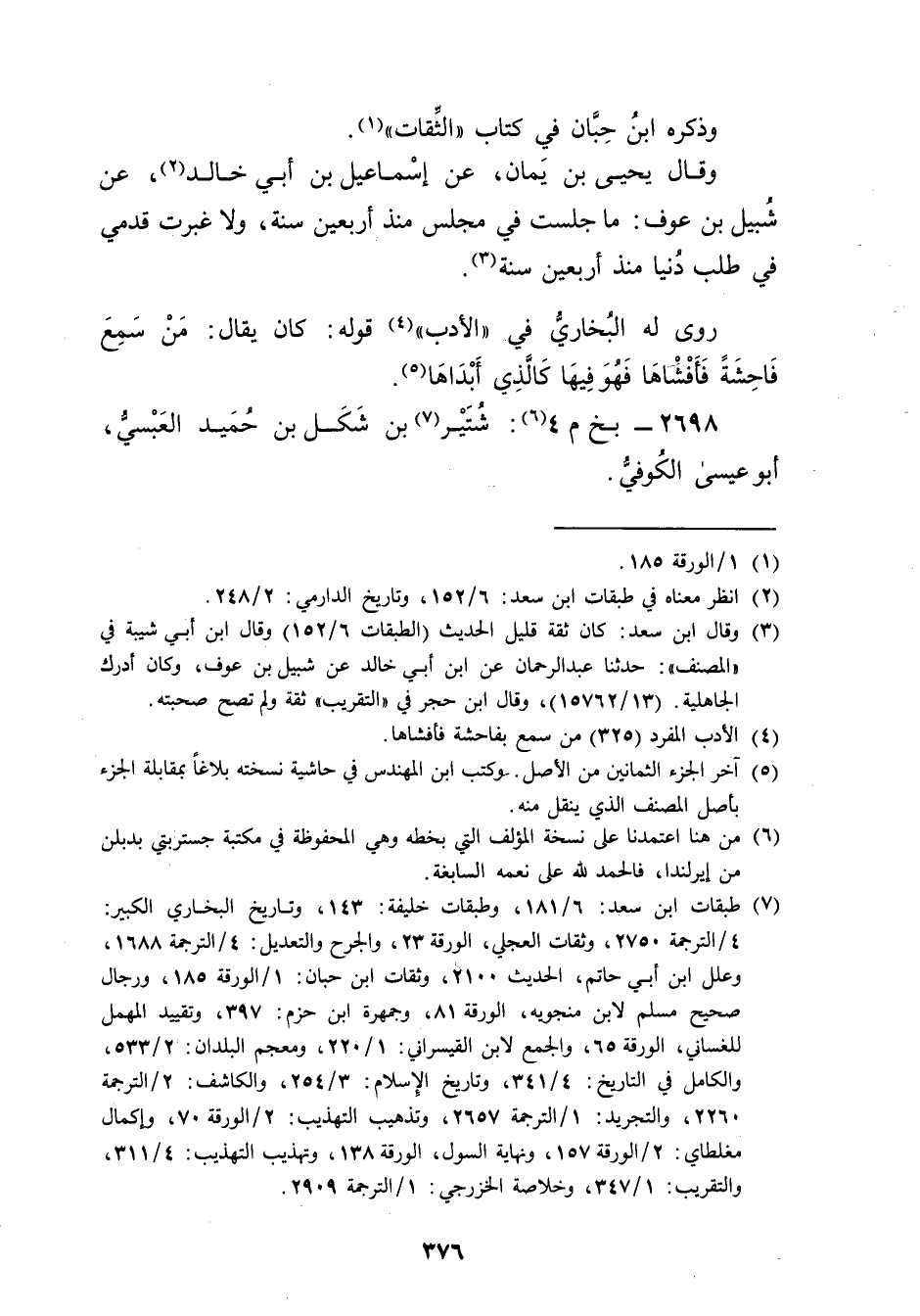 (3) وَقَال ابن سعد: كان ثقة قليل الحديث (الطبقات 6 / 152) وَقَال ابن أَبي شَيْبَة في "المصنف": حَدَّثَنَا عبد الرحمن عن ابن أَبي خاد عن شبيل بن عوف، وكان أدرك الجاهلية. (13 / 15762) ، وَقَال ابن حجر في "التقريب"ثقة ولم تصح صحبته.