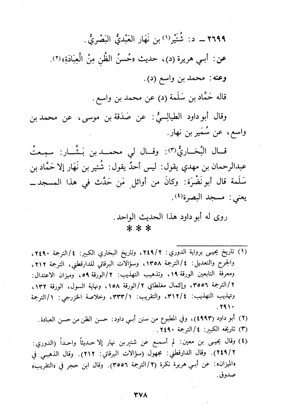 (4) وَقَال يحيى بن مَعِين: لم أسمع عن شتير بن نهار إلا حديثًا واحدًا (الدوري: 2 / 249) . وَقَال الدَّارَقُطْنِيُّ: مجهول (سؤالات البرقاني: 212) . وَقَال الذهبي في "الميزان": عَن أبي هُرَيْرة نكرة (2 / الترجمة 3556) . وَقَال ابن حجر في "التقريب"صدوق.